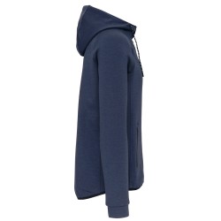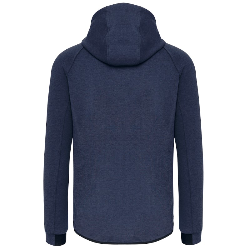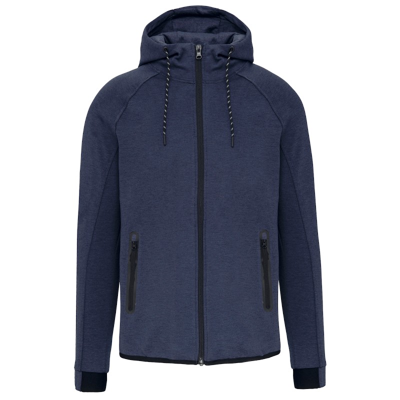 94% polyester/ 6% élasthanne (79% polyester/ 15% viscose/ 6% élasthanne pour coloris chiné). Matière ultra confortable. Fermeture zippée. 2 poches avant zippées finition thermosoudée. Capuche doublure jersey 65% polyester/ 35% viscose avec cordon de serrage bicolore finition embout plastique. Bas de manches resserrés avec une partie élastiquée contrastée et bas de vêtement finition biais contrasté Black sur tous les coloris et Dark Grey sur le Ash Heather (fermetures aussi).
