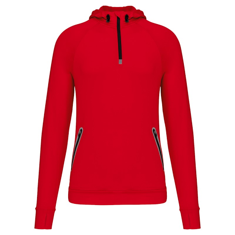 90% polyester / 10% élasthanne. Tissu jersey gratté ultra doux. Manches raglan. 2 poches zippées et réfléchissantes. Zips et cordons : White pour le coloris Navy, Black pour le coloris Red et Sport Grey Mélange et Lime pour le coloris Dark Grey.