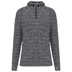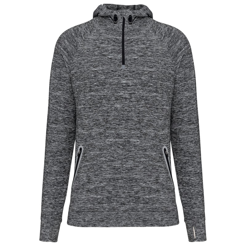90% polyester / 10% élasthanne. Tissu jersey gratté ultra doux. Manches raglan. 2 poches zippées et réfléchissantes. Zips et cordons : White pour le coloris Navy, Black pour le coloris Red et Sport Grey Mélange et Lime pour le coloris Dark Grey.