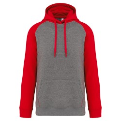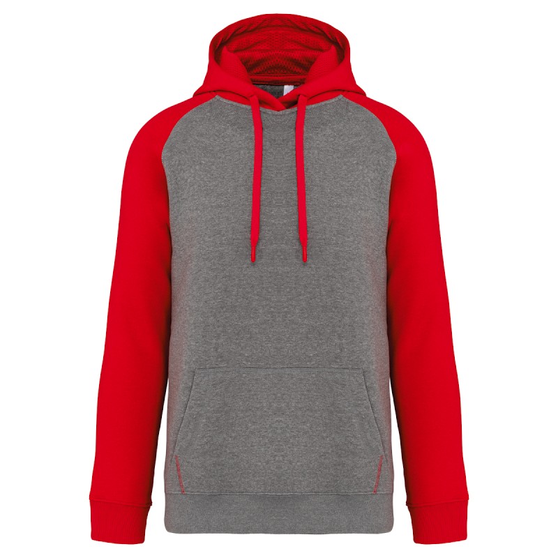65% polyester / 35% coton. Molleton gratté. Manches raglan et capuche contrastées. Capuche doublée en maille filet ton sur ton. Poches kangourou avec poche téléphone fluorescente. Passe-fil écouteurs. Poignets et bas de vêtement en bord-côte double épaisseur 2 x 2.