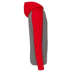 65% polyester / 35% coton. Molleton gratté. Manches raglan et capuche contrastées. Capuche doublée en maille filet ton sur ton. Poches kangourou avec poche téléphone fluorescente. Passe-fil écouteurs. Poignets et bas de vêtement en bord-côte double épaisseur 2 x 2.