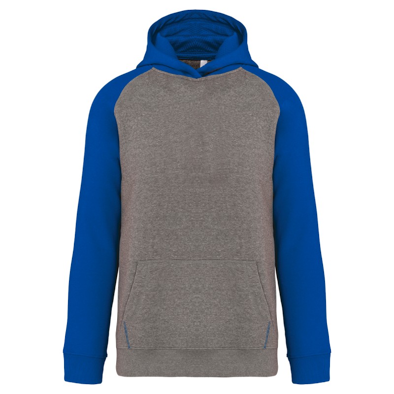 65% polyester / 35% coton. Molleton gratté. Manches raglan et capuche contrastées. Capuche doublée en maille filet ton sur ton. Poches kangourou avec poche téléphone fluorescente. Passe-fil écouteurs. Poignets et bas de vêtement en bord-côte double épaisseur 2 x 2.