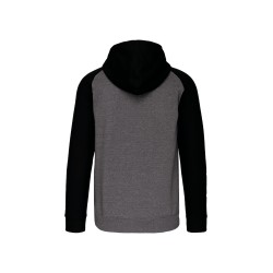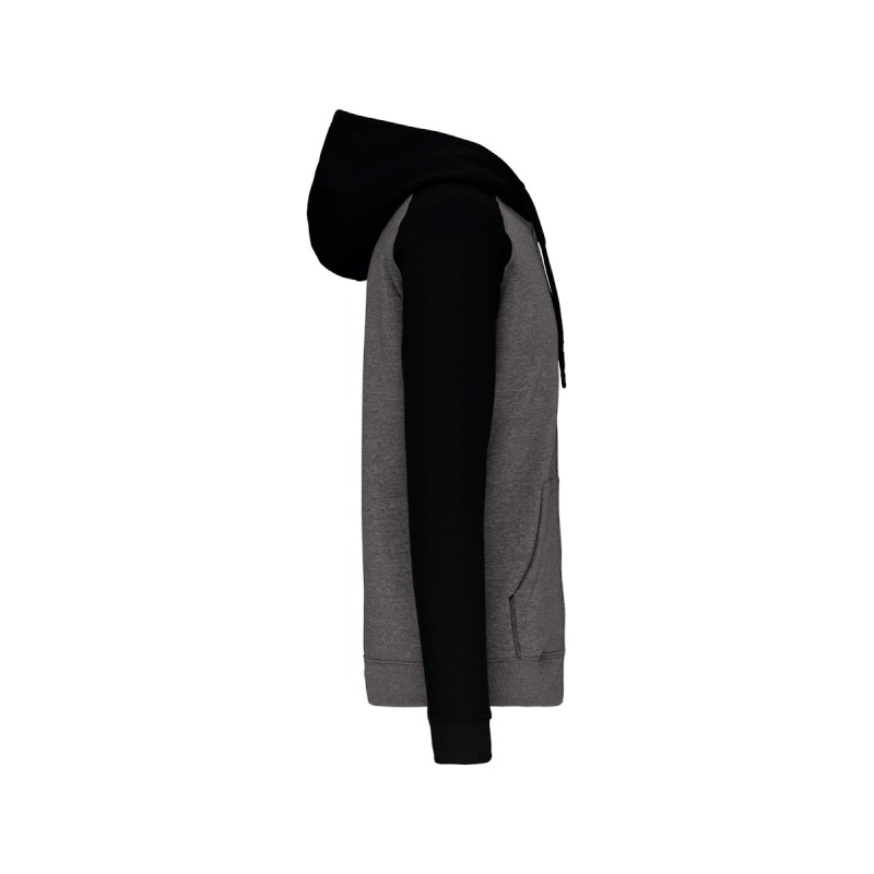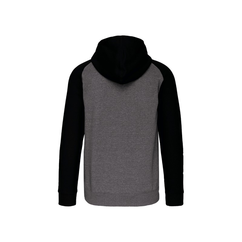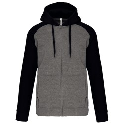 65% polyester / 35% coton. Molleton gratté. Fermeture zippée. Manches raglan et capuche contrastées. Capuche doublée en maille filet ton sur ton. Poches kangourou avec poche téléphone fluorescente. Passe-fil écouteurs. Poignets et bas de vêtement en bord-côte double épaisseur 2x2.