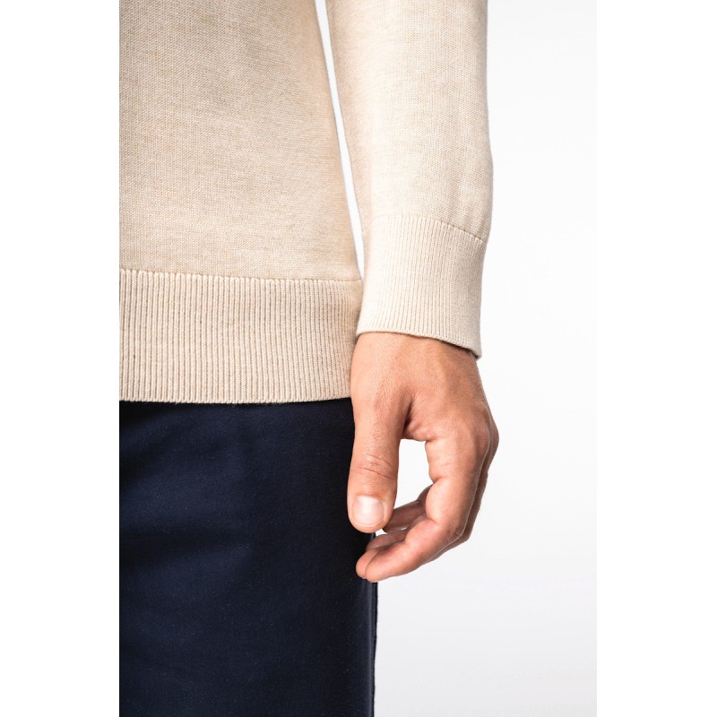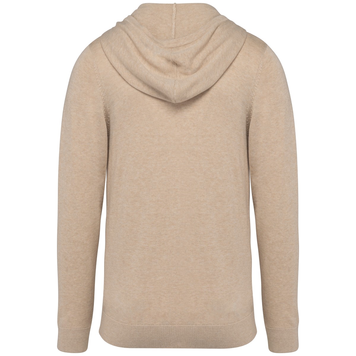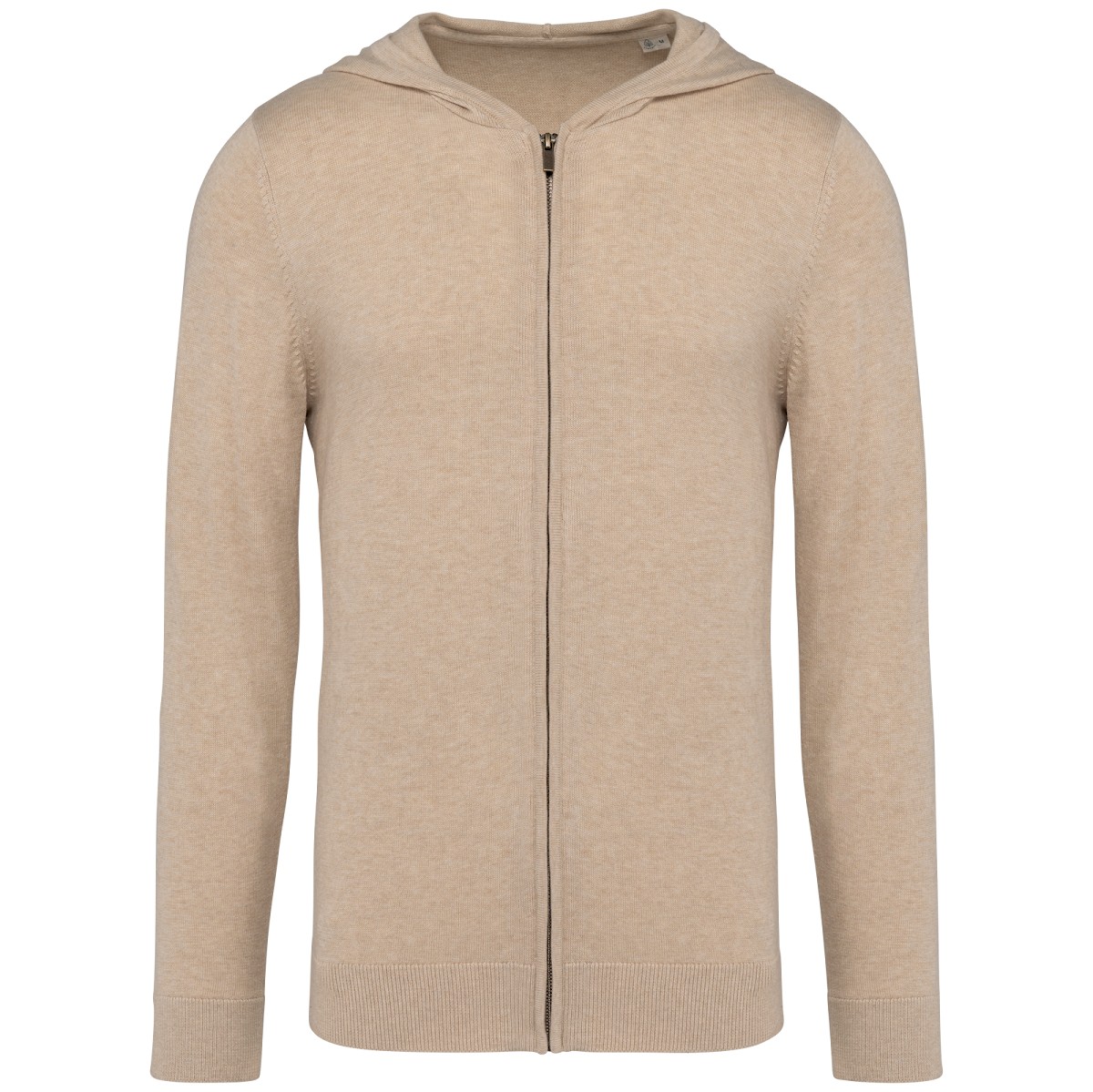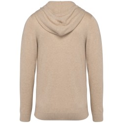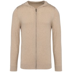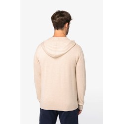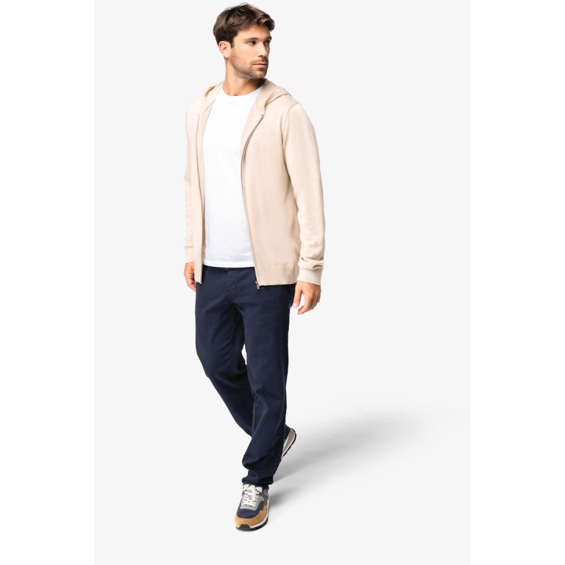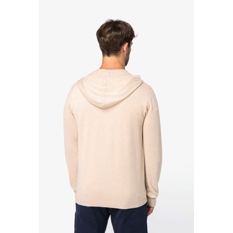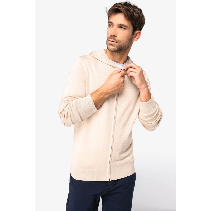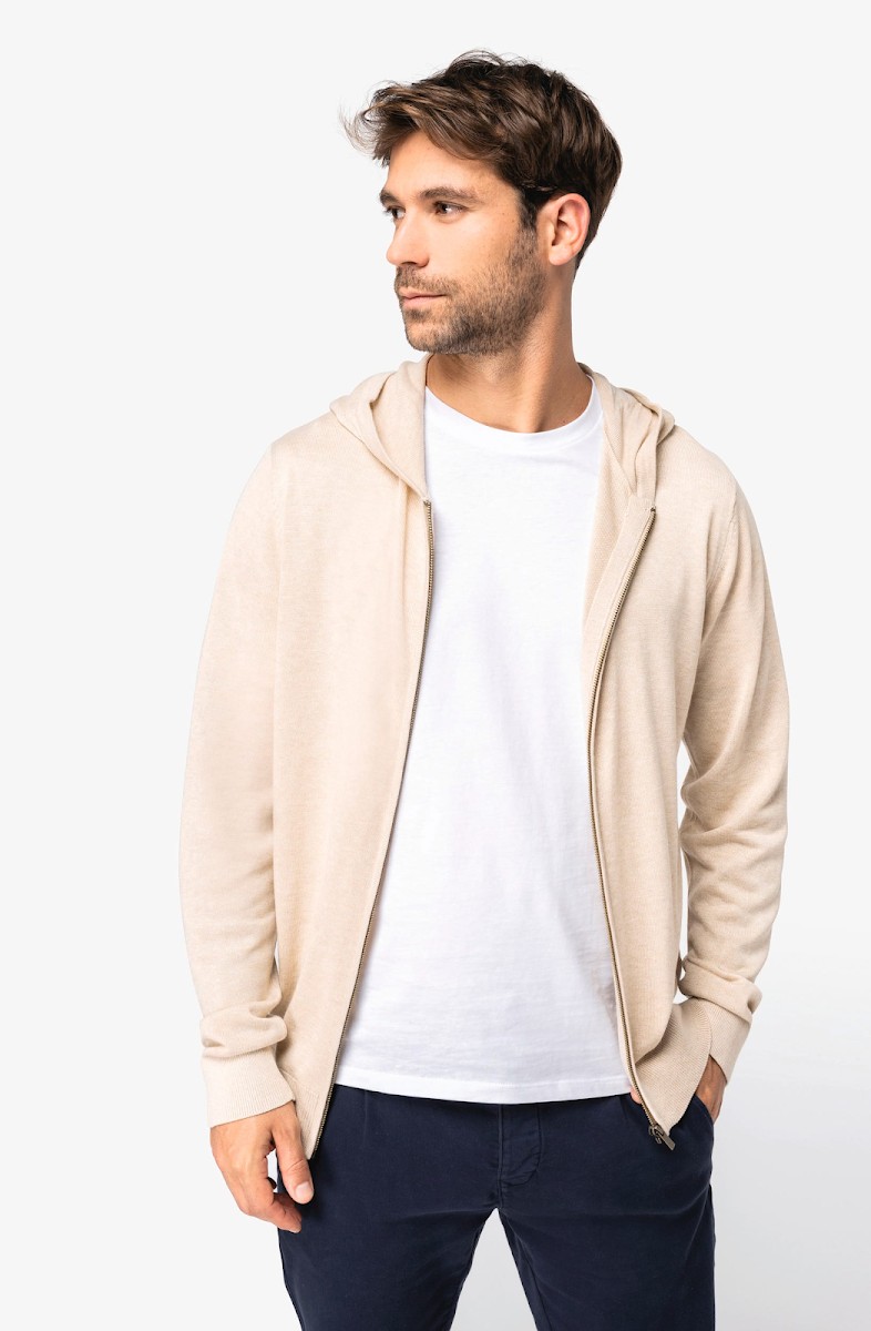 50% coton biologique / 50% Lyocell TENCEL™*. Coton peigné. Jauge 12. Coupe ajustée. Bande de propreté en matière principale. Zip en métal recyclé avec finition bord-à-bord. Bord côte 1 x 1 au bas de vêtement et bas de manches. Capuche 2 panneaux sans cordon de serrage. Tricoté en « Fully Fashion ». Poids moyen en taille L : 435 g. *TENCEL™ est une marque de Lenzing AG.