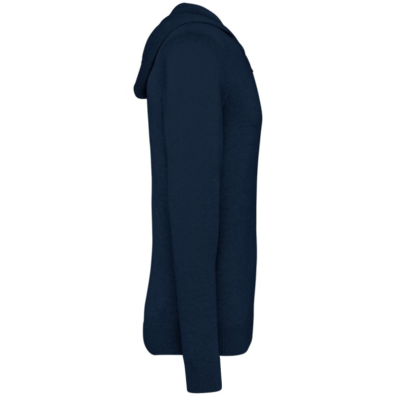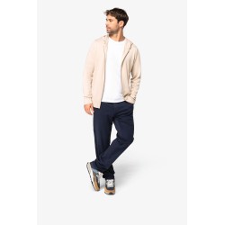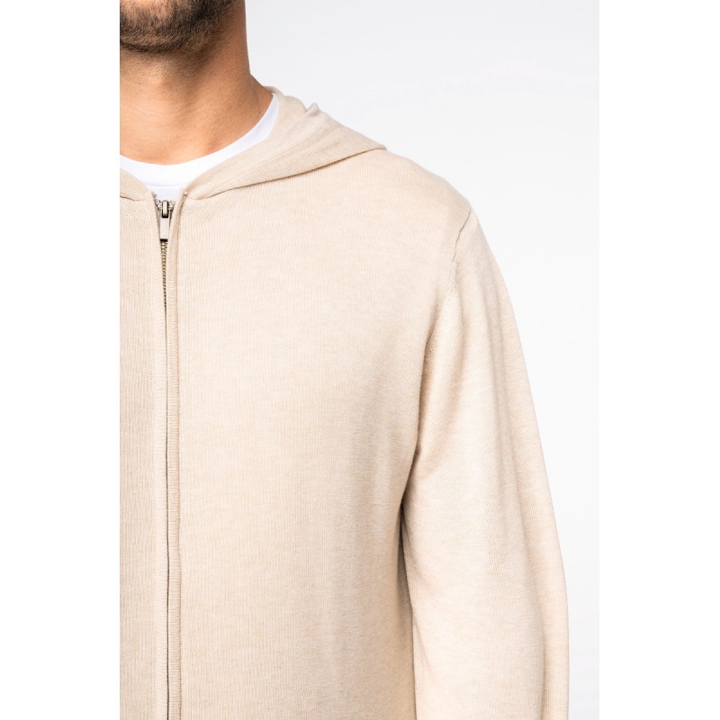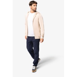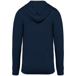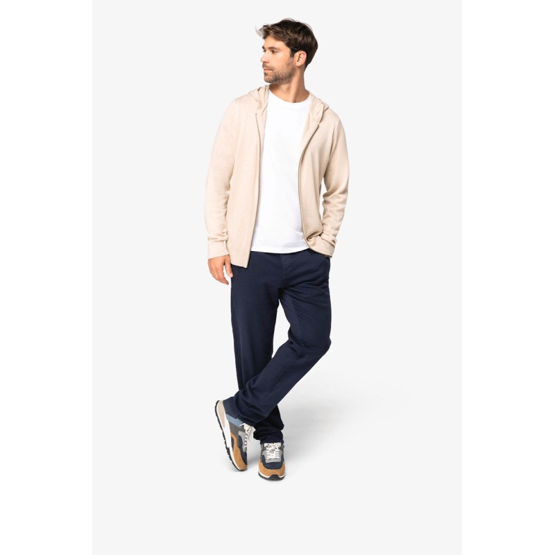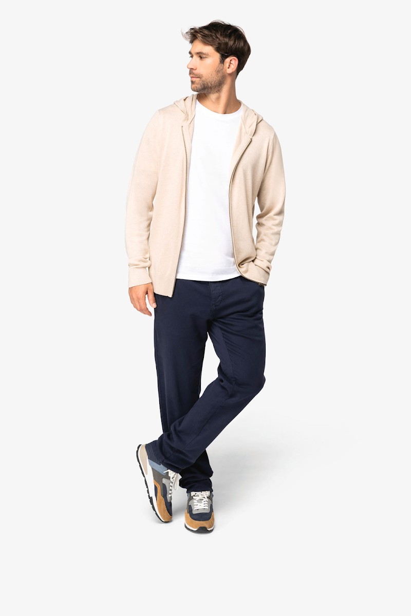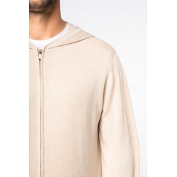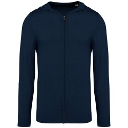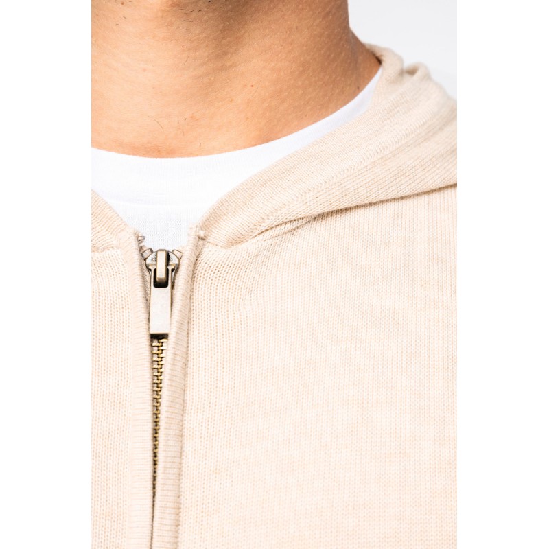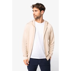 50% coton biologique / 50% Lyocell TENCEL™*. Coton peigné. Jauge 12. Coupe ajustée. Bande de propreté en matière principale. Zip en métal recyclé avec finition bord-à-bord. Bord côte 1 x 1 au bas de vêtement et bas de manches. Capuche 2 panneaux sans cordon de serrage. Tricoté en « Fully Fashion ». Poids moyen en taille L : 435 g. *TENCEL™ est une marque de Lenzing AG.