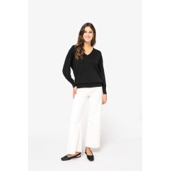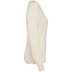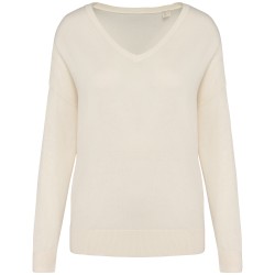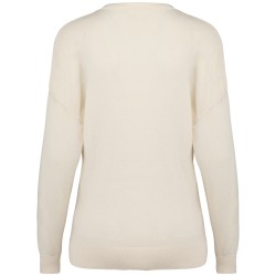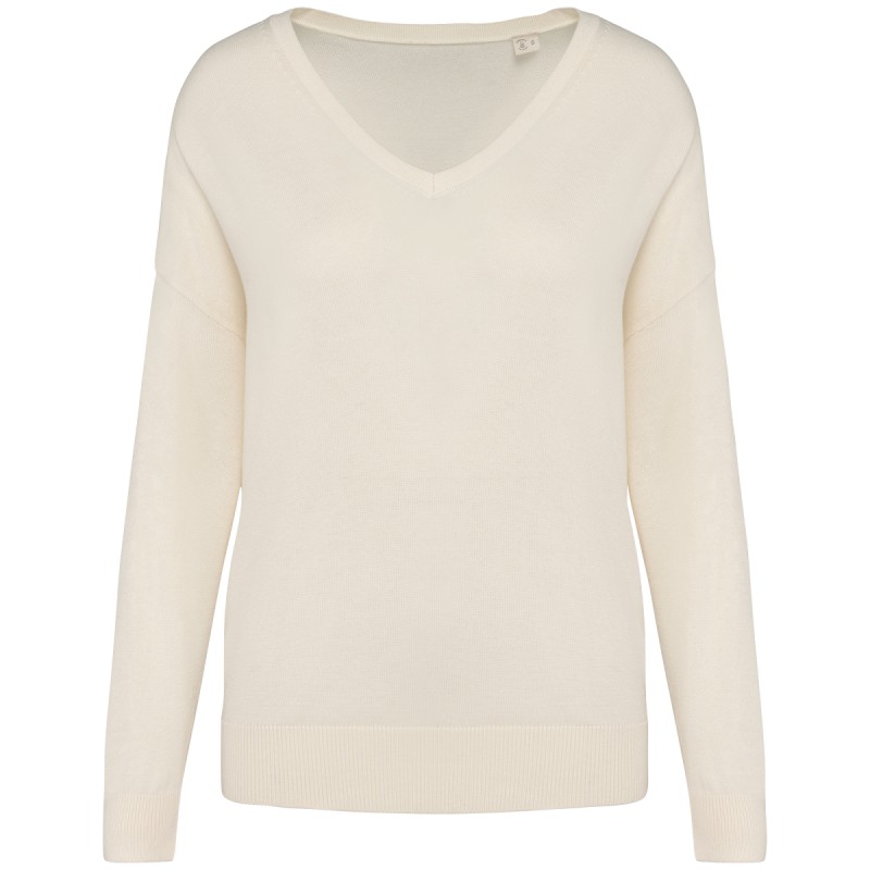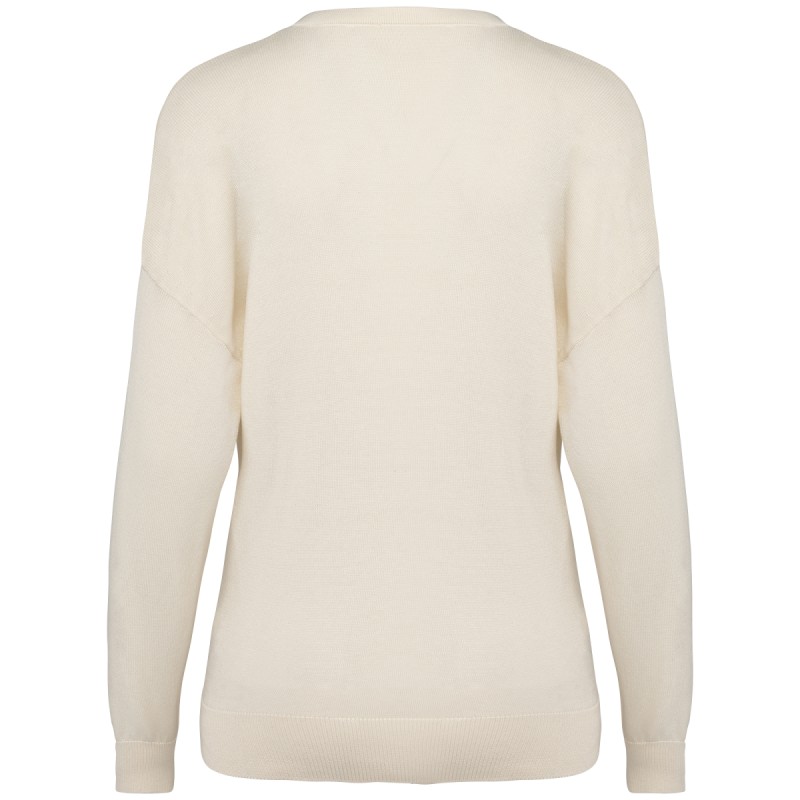 50% coton biologique / 50% Lyocell TENCEL™*. Coton peigné. Jauge 12. Coupe droite. Epaules tombantes. Col V. Bord côte 1 x 1 à l’encolure, bas de manches et de vêtement. Tricoté en « Fully Fashion ». Poids moyen en taille M : 280 g. *TENCEL™ est une marque de Lenzing AG.