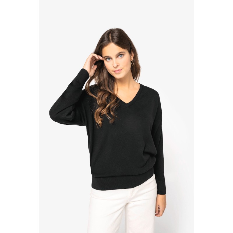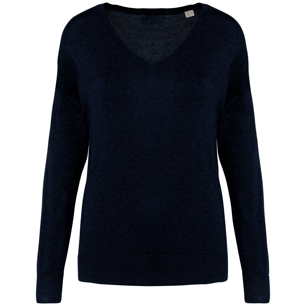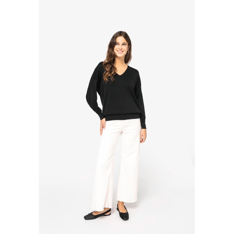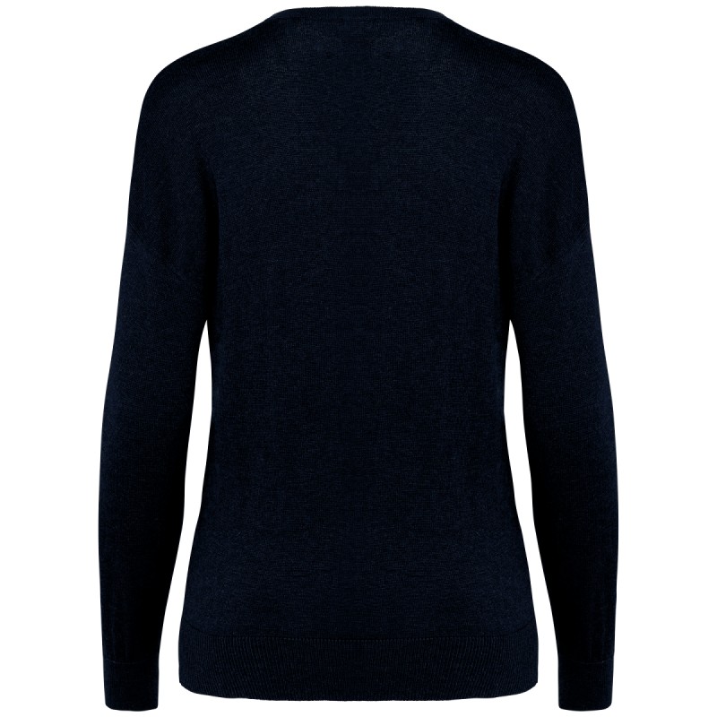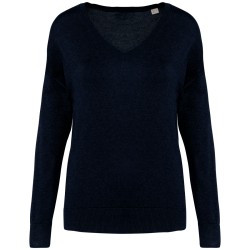 50% coton biologique / 50% Lyocell TENCEL™*. Coton peigné. Jauge 12. Coupe droite. Epaules tombantes. Col V. Bord côte 1 x 1 à l’encolure, bas de manches et de vêtement. Tricoté en « Fully Fashion ». Poids moyen en taille M : 280 g. *TENCEL™ est une marque de Lenzing AG.