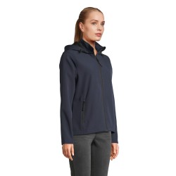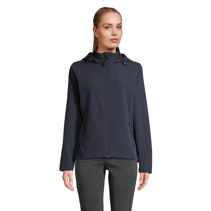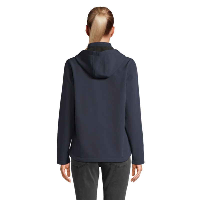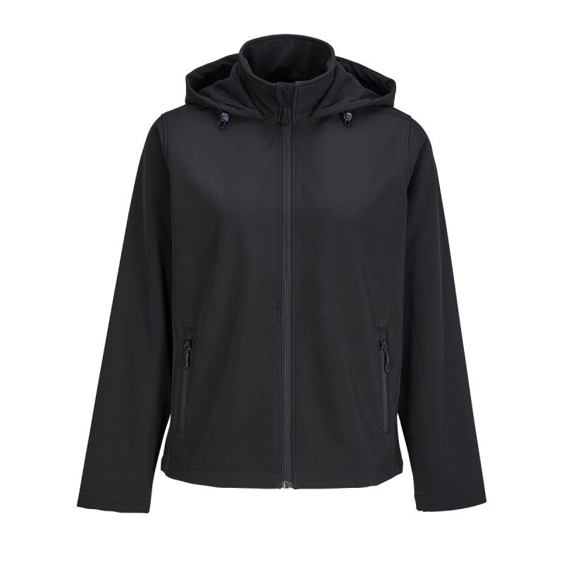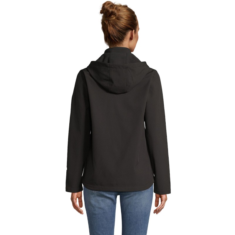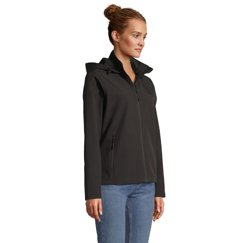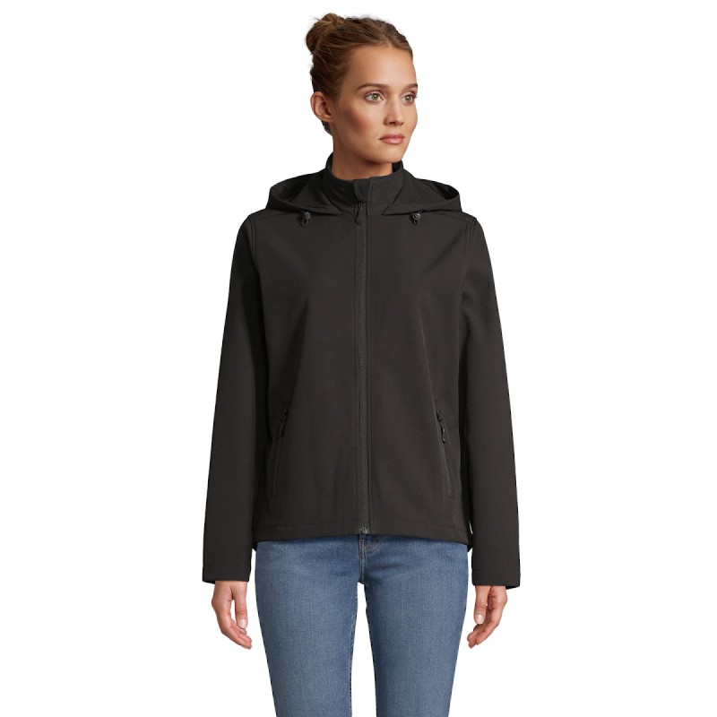 VESTE CAPUCHE SOFTSHELL FEMMEOuverture principale et poches latérales avec zip nylon noir