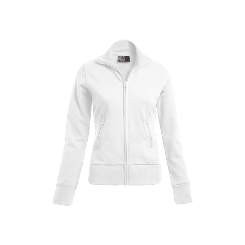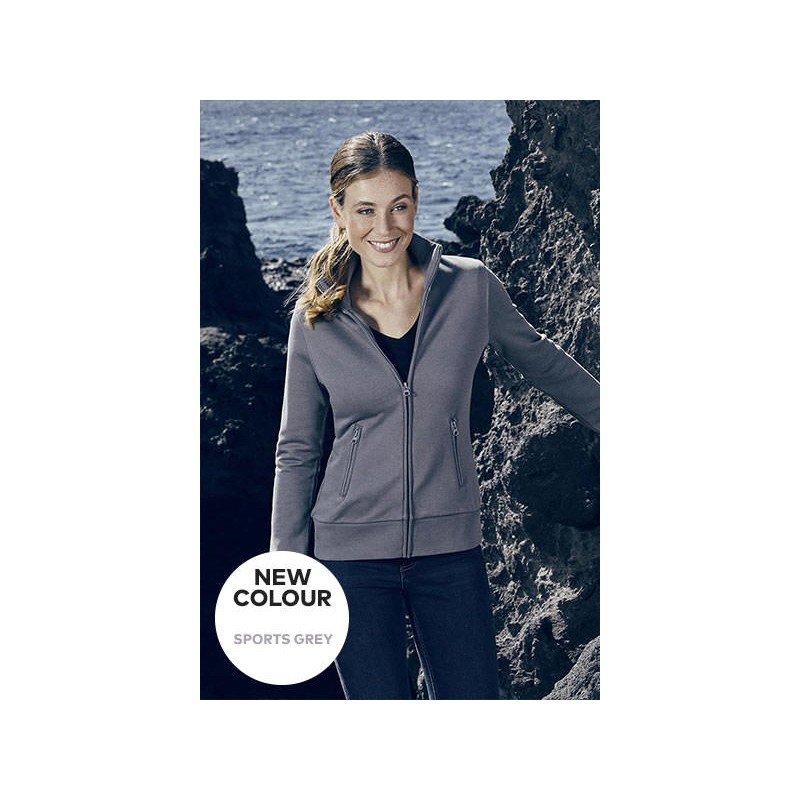 Veste femme col montant Veste sweat, col montant, fermeture éclair sur toute la longueur et dissimulée, 2 poches zippées sur le devant, poignets et taille en élasthanne, molleton brossé, 100 % coton, 320 g/m², XS–XXXL.