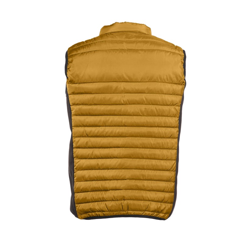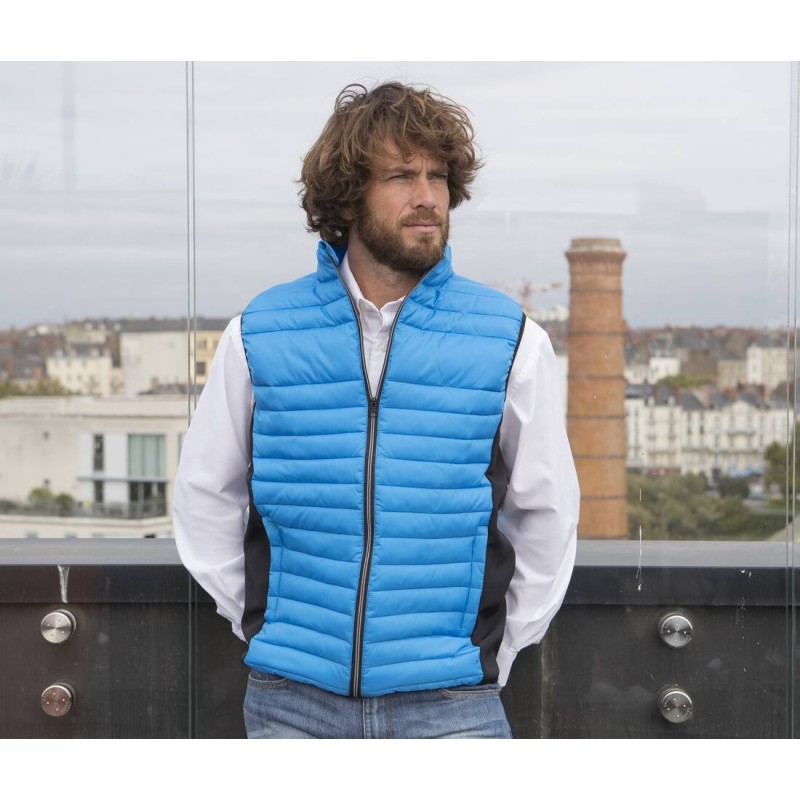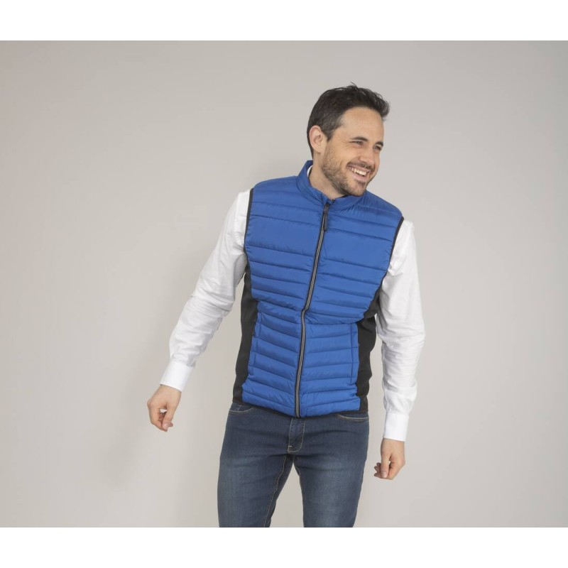 Bodywarmer léger moderne bi-matière. 2 poches latérales zippées. Zips contrastés.