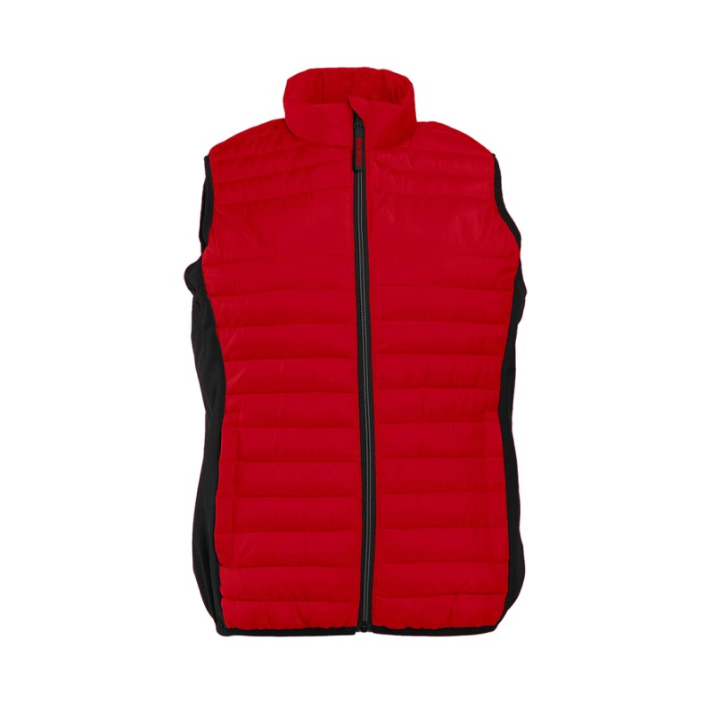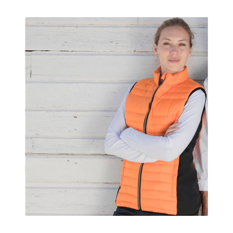 Bodywarmer léger moderne bi-matière. 2 poches latérales zippées. Zips contrastés.