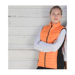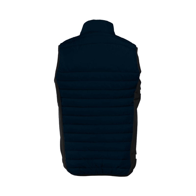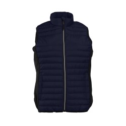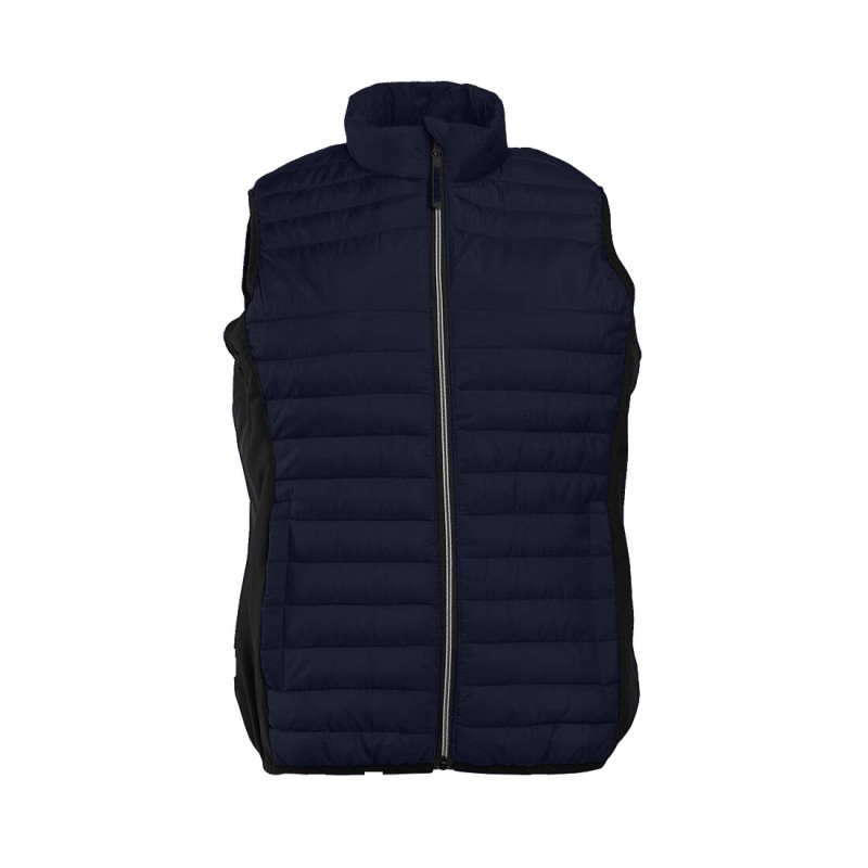 Bodywarmer léger moderne bi-matière. 2 poches latérales zippées. Zips contrastés.