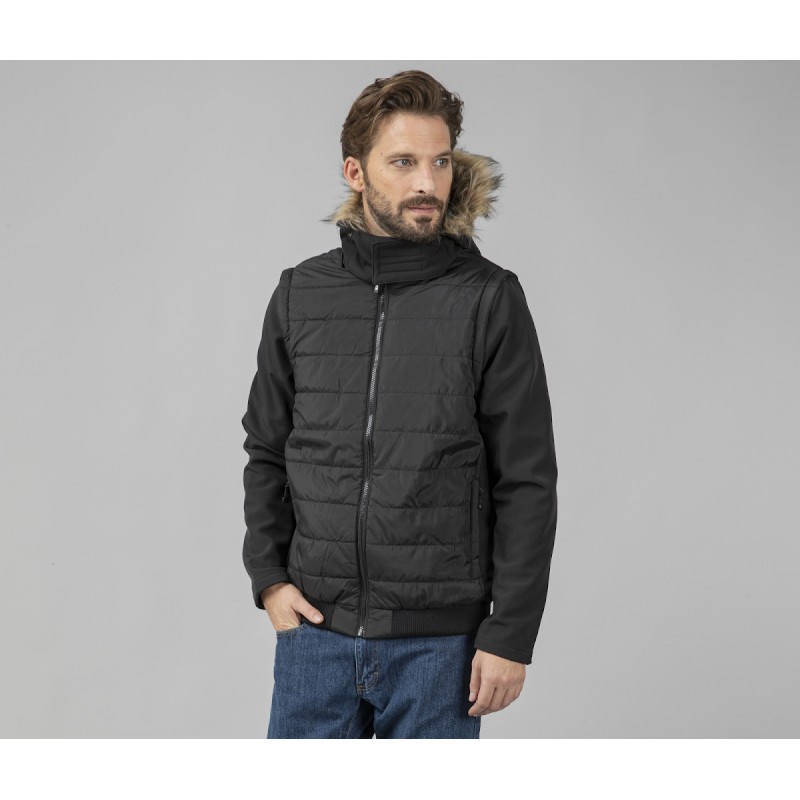 Veste matelassée aux manches amovibles. Combinaison de 2 matières : corps matelassé, manches et côtés en Softshell. Possibilité d'ajouter les capuches Réf. PK995, Réf. PK996, Réf. PK997.