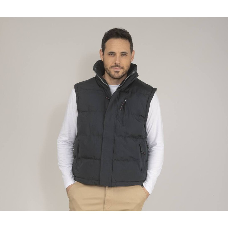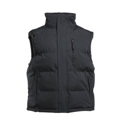 Doudoune sans manche avec enduction Weather Block+®. Capuche dans le col. 2 poches latérales zippées et 1 poche cœur zippée.