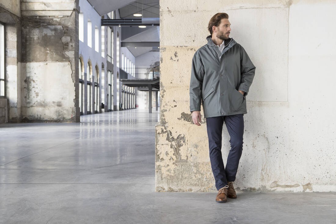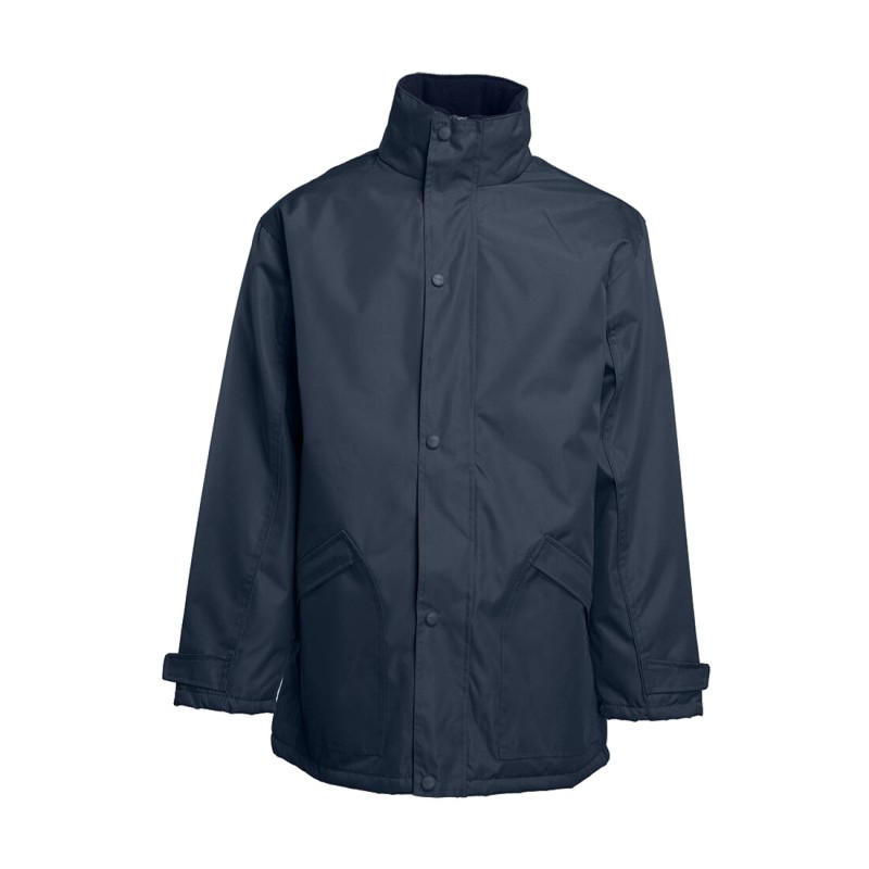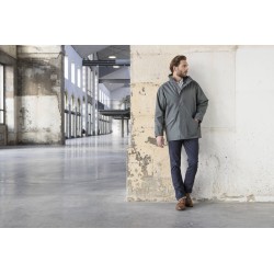 Coupe-vent avec enduction imperméable 1000mm. 2 poches extérieures zippées et 2 poches intérieures (portefeuille et GSM). Capuche dans le col.