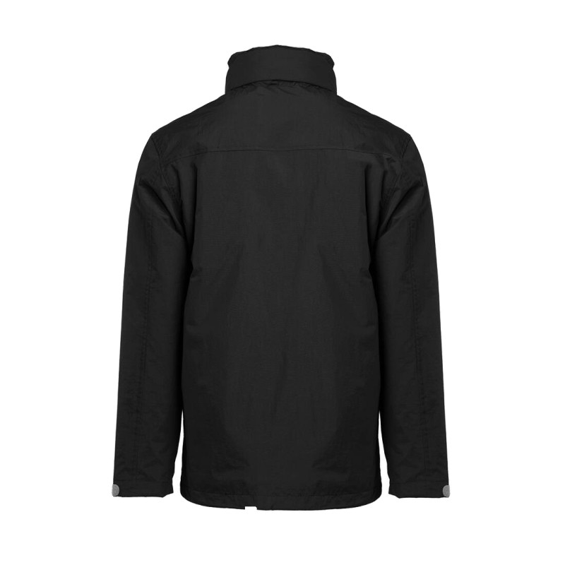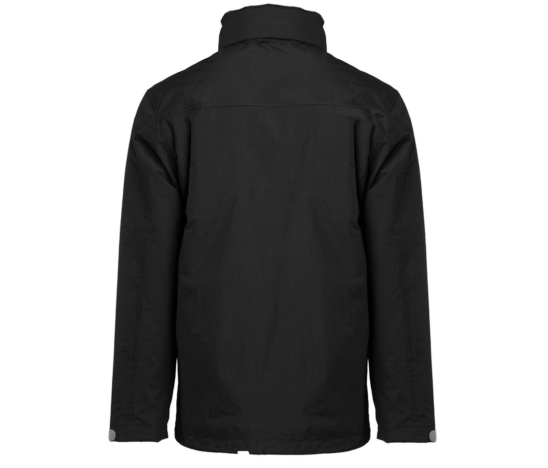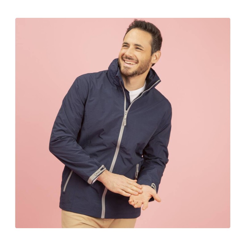 Capuche dans le col avec cordon contrasté. 2 poches zippées latérales. Fermetures Éclair® contrastées.