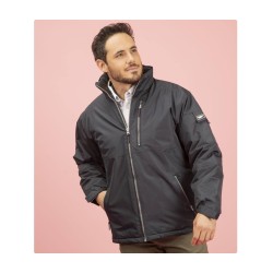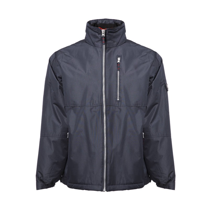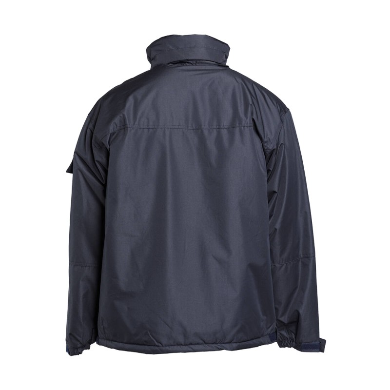 Coupe-vent respirant et imperméable. Capuche dans le col. 1 poche poitrine et 2 poches latérales zippées.