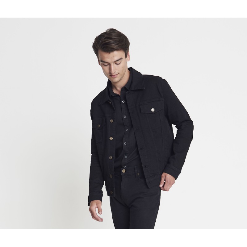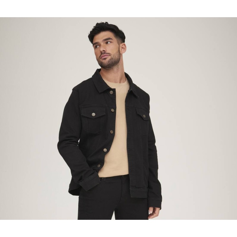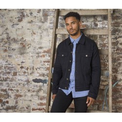 Coupe moderne. Jean stretch. Bouton de décoration aux poignets. Bride de suspension à l'intérieur du col.