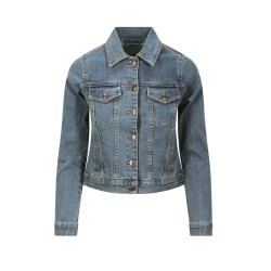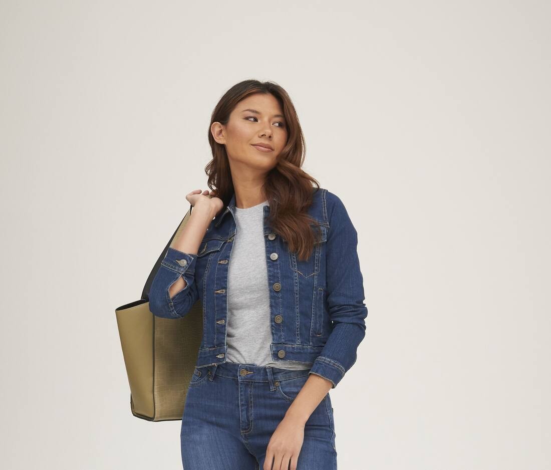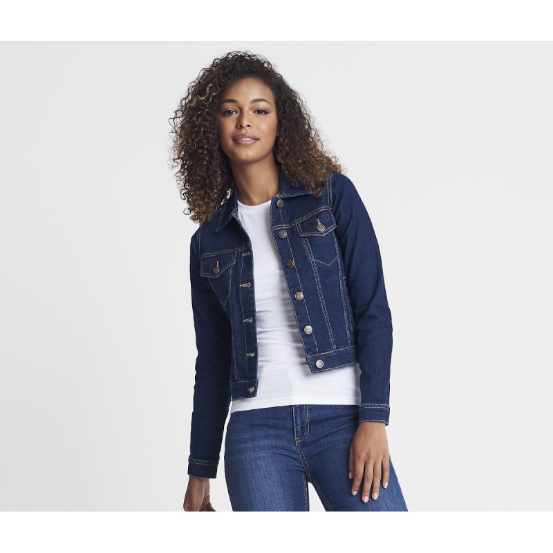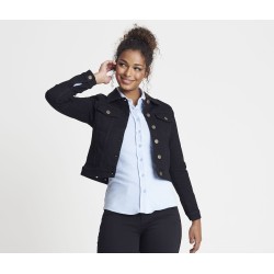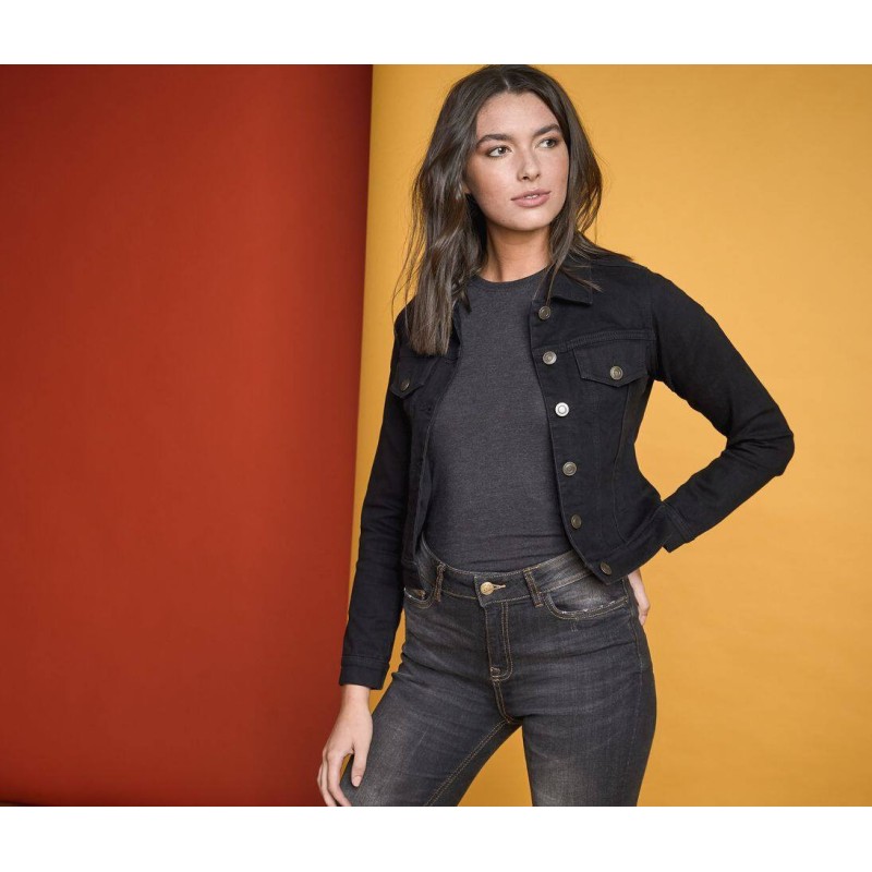 Coupe contemporaine féminine. Jean stretch. 4 poches. Bouton de décoration aux poignets. Bride de suspension à l'intérieur du col.