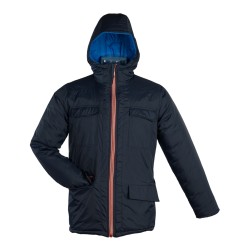 Face B : blouson 100% nylon 40D, garnissage ouatine, 2 poches plaquées poitrine avec rabat, 2 poches mains avec rabats et une poche valeur zippée tricolore, zip tricolore