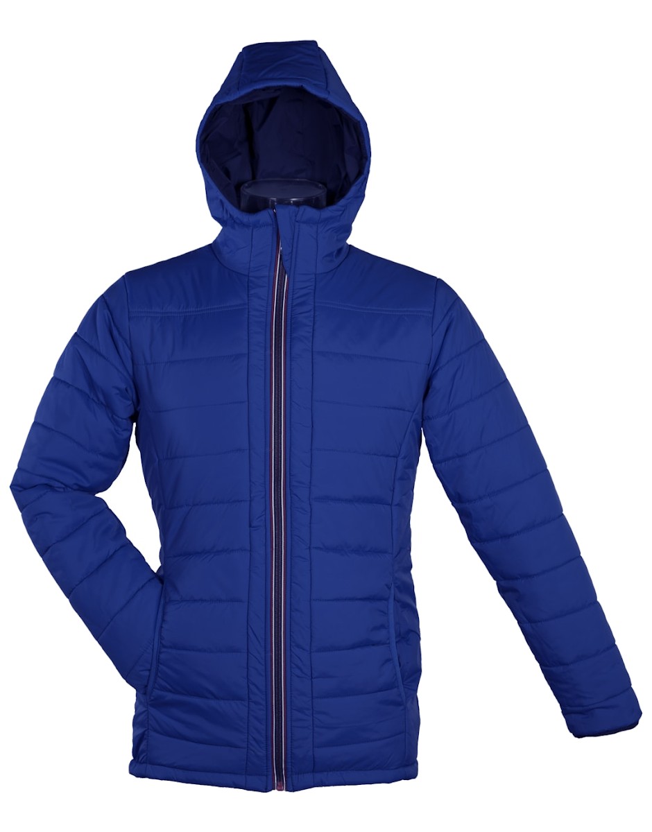 Face A : doudoune 100% nylon 40D, garnissage ouatine, 2 poches mains avec passepoil de finition, zip tricolore. Zip invisible sur le flanc gauche pour personnalisation.