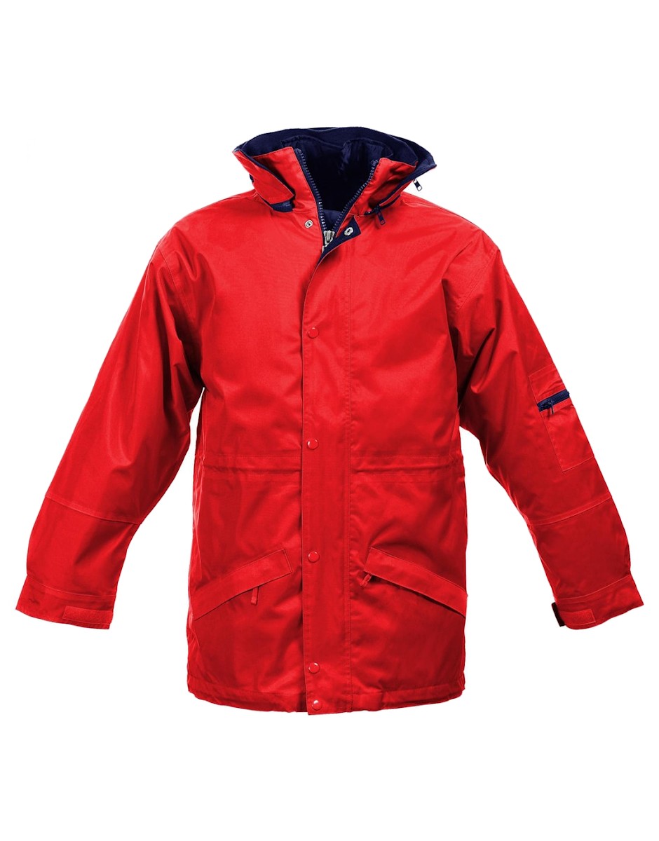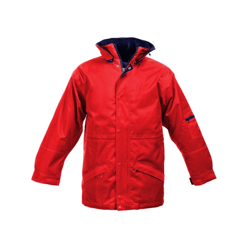 Parka : Extérieur Nylon Oxford enduction imperméable. Doublure mesh. Coutures soudées étanches. Zip double sens sous rabat central avec pressions. Col capuche amovible doublé polaire. 2 poches mains zippées. 1 poche zippée sur la manche gauche. 1 poche portefeuille. Poignets réglables par Velcro. Oeillets d'aération sous les bras. Cordon de serrage à la taille et en bas de la parka. Ouverture zippée pour le marquage. Blouson intérieur : Polyester matellassé. 2 poches plaquées. Bord côte aux poignets. Disponible sur stock et livré sous 24/48h sans personnalisation, coloris disponibles : Rouge, Orange, Vert, Marine, Gris dans les tailles XXS, XS, S, M, L, XL, 2XL, 3XL, 4XL, 5XL, 6XL