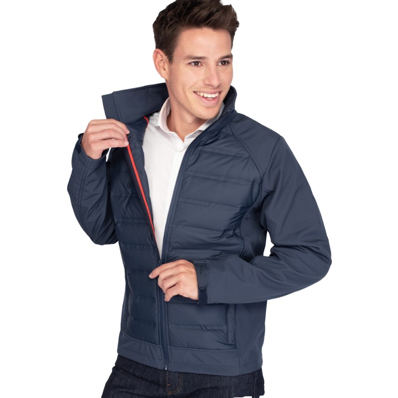 Blouson hybride pour sa combination softshell-doudoune. Le buste est constitué d’une doudoune en duvet véritable avec une construction soudée, imperméable et déperlante. Les manches, les épaules et le dos sont composés d’une matière softshell 3 couches avec membrane qui rend le produit imperméable et déperlant. La doudoune donne le confort et la chaleur quand la softshell confère tenue et allure. 2 poches zippées pour les mains. Revêtement en polyester 50D. Disponible sur stock et livré sous 24/48h sans personnalisation, coloris disponibles : Gris dans les tailles 2XL