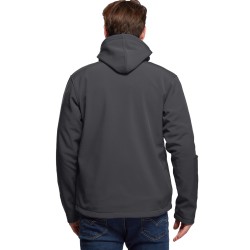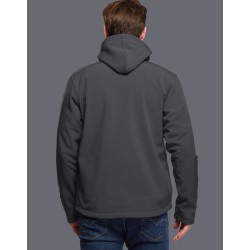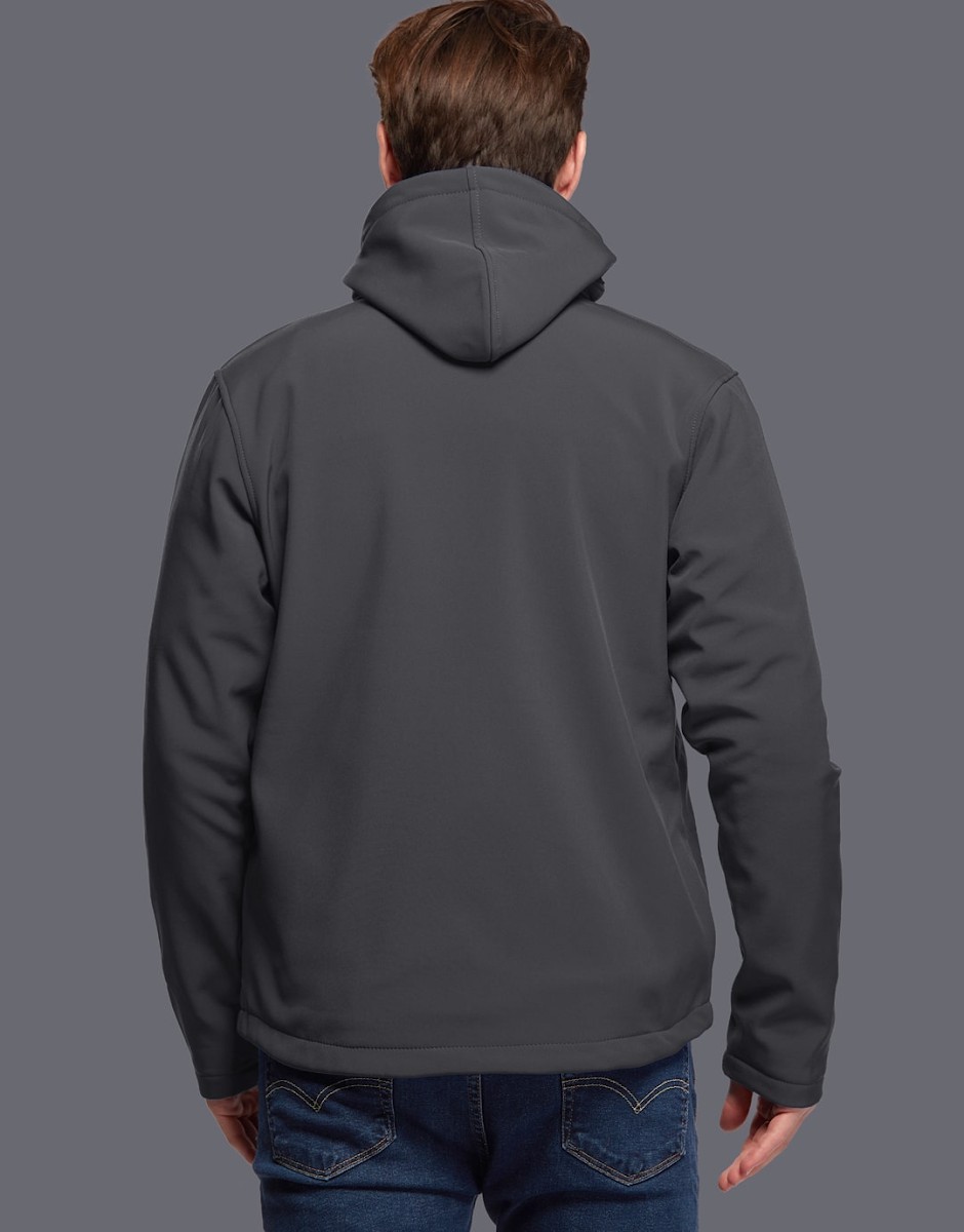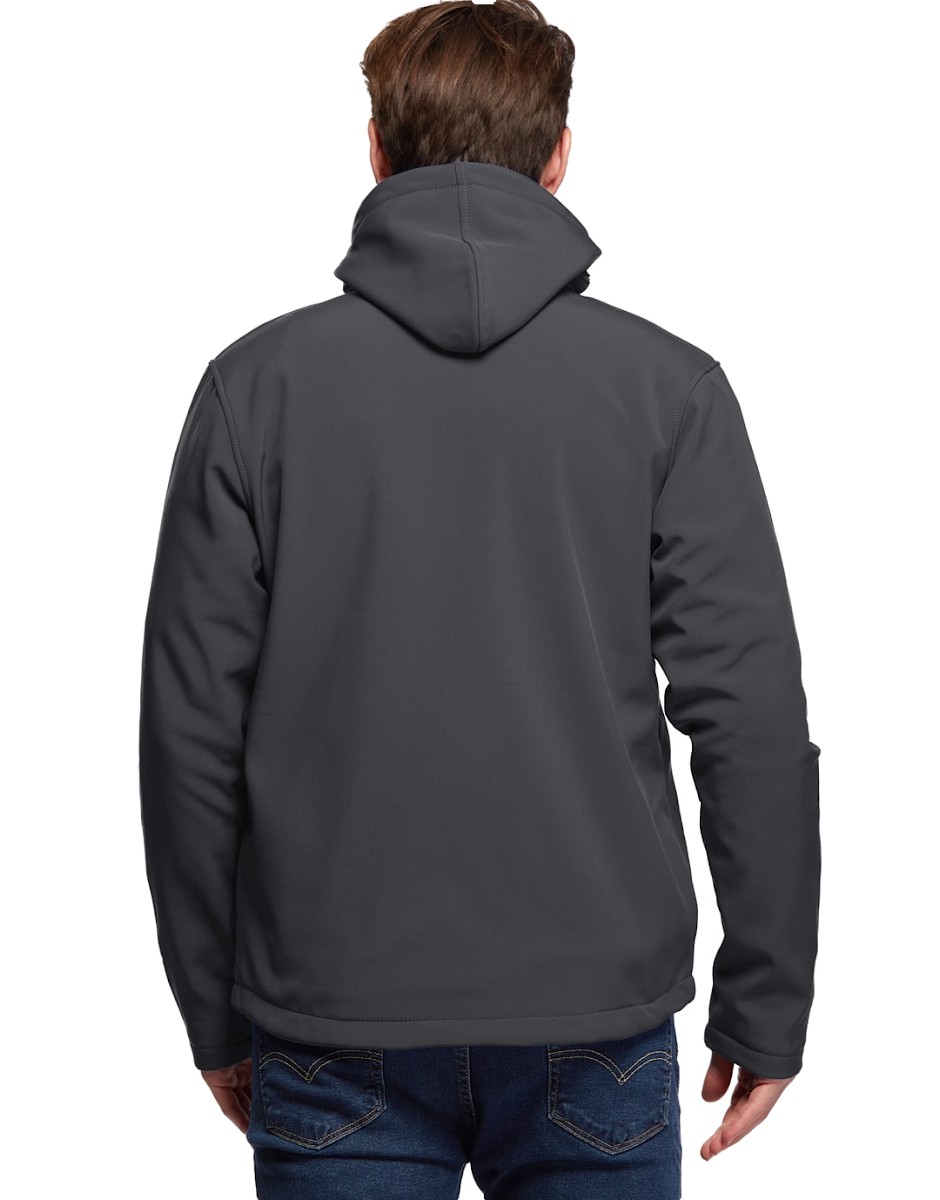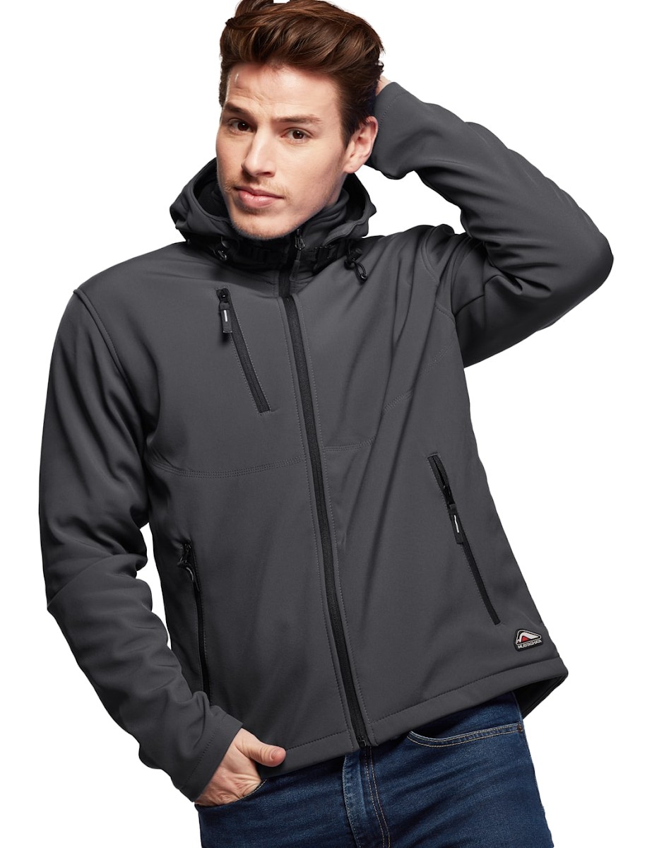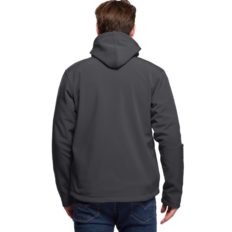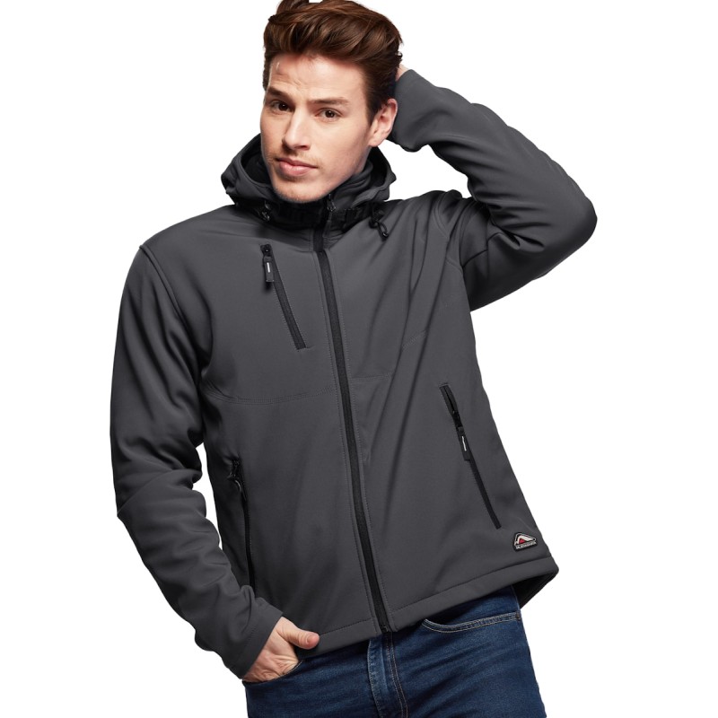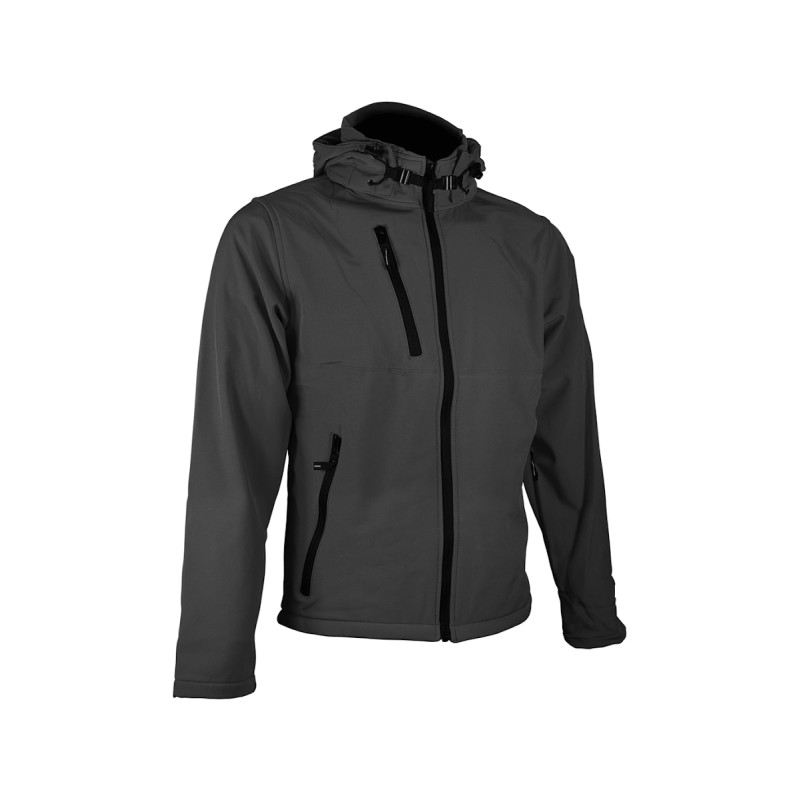 Blouson Softshell capuche détachable, 94% Polyester / 6% Elasthanne. Respirant et déperlant. Polaire Contre-collée. Doublure intérieure par dessus les poches. 2 poches main zippées. 1 poche poitrine zippée. Capuche ajustable amovible fixée par zip et crochets. Cordon de serrage à la taille. Disponible sur stock et livré sous 24/48h sans personnalisation, coloris disponibles : Gris dans les tailles 2XL
