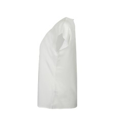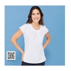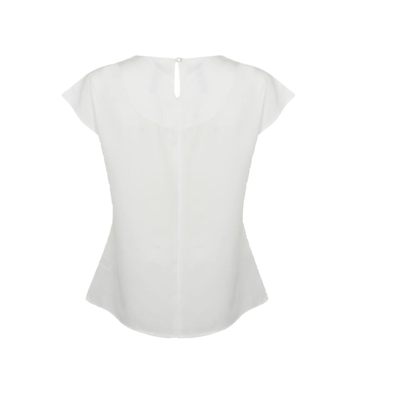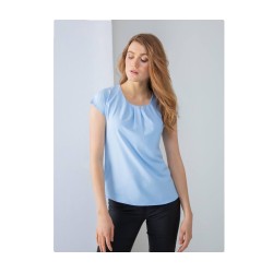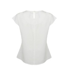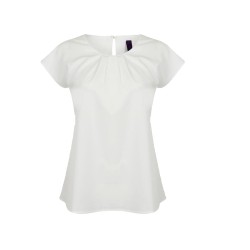 Plis sur le devant. Fermeture par bouton dans le dos. Ourlet arrondi.