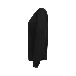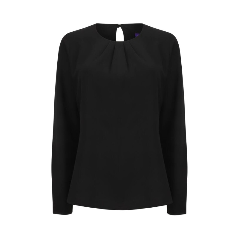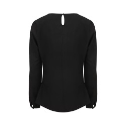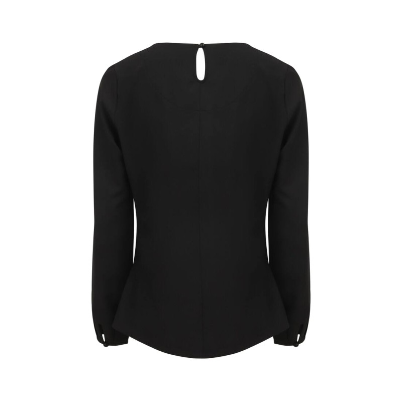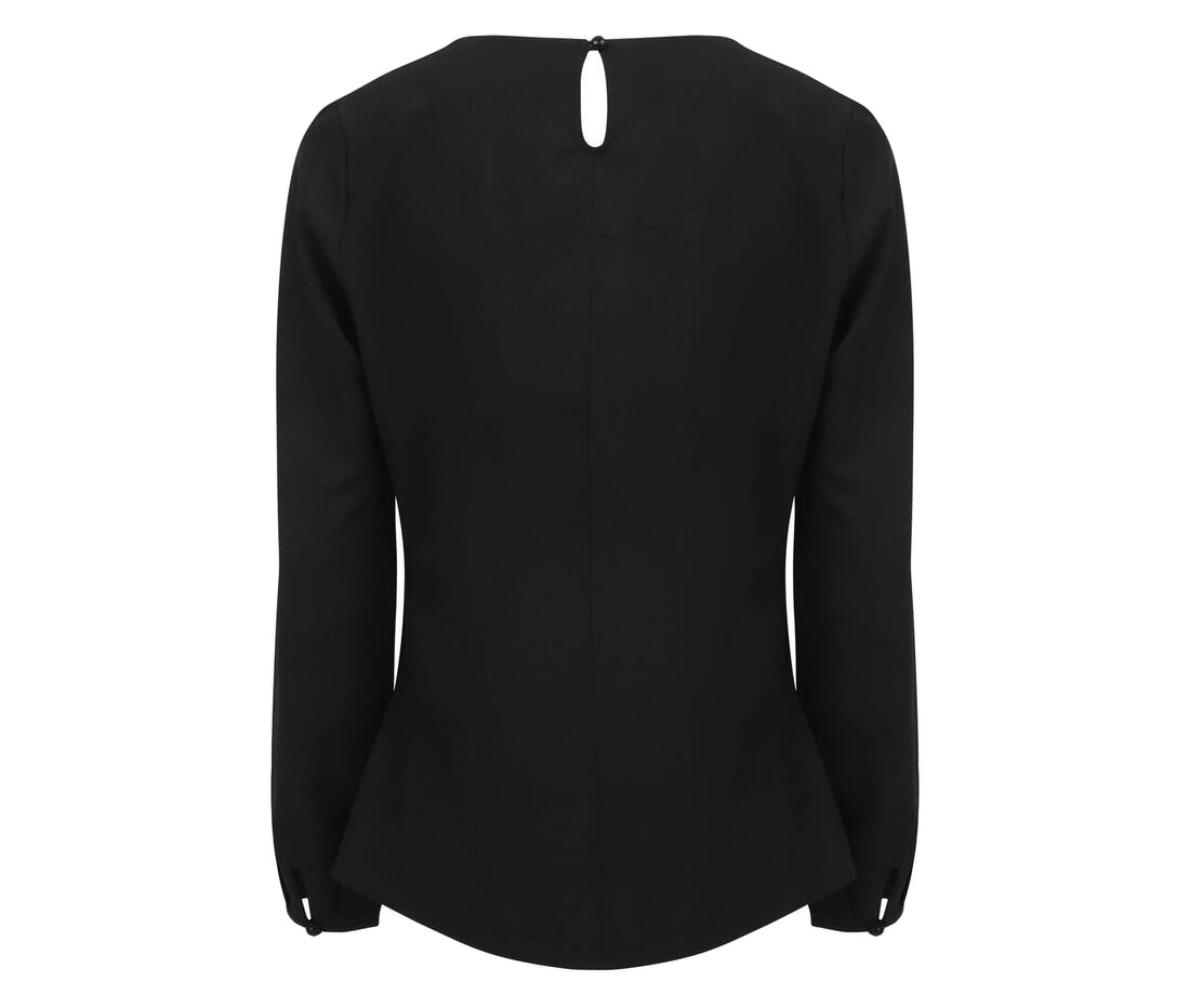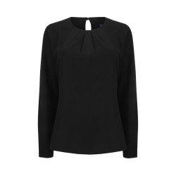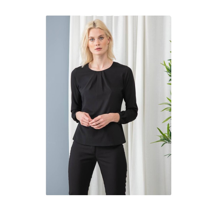 Plis sur le devant. Fermeture par bouton dans le dos. Ourlet arrondi.