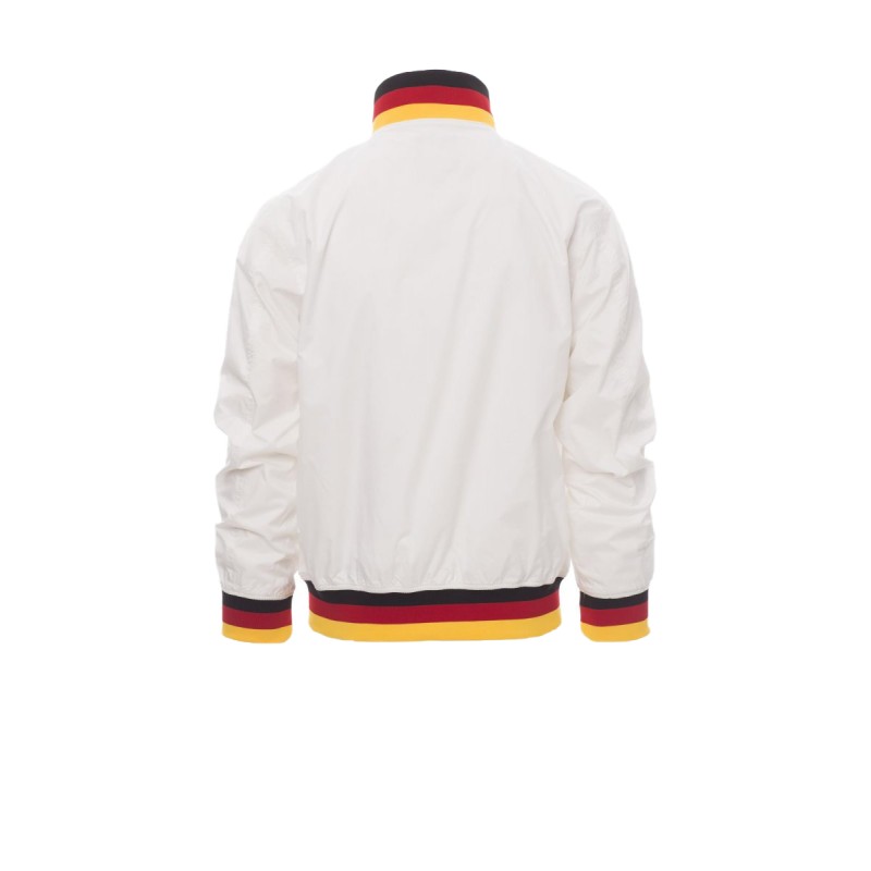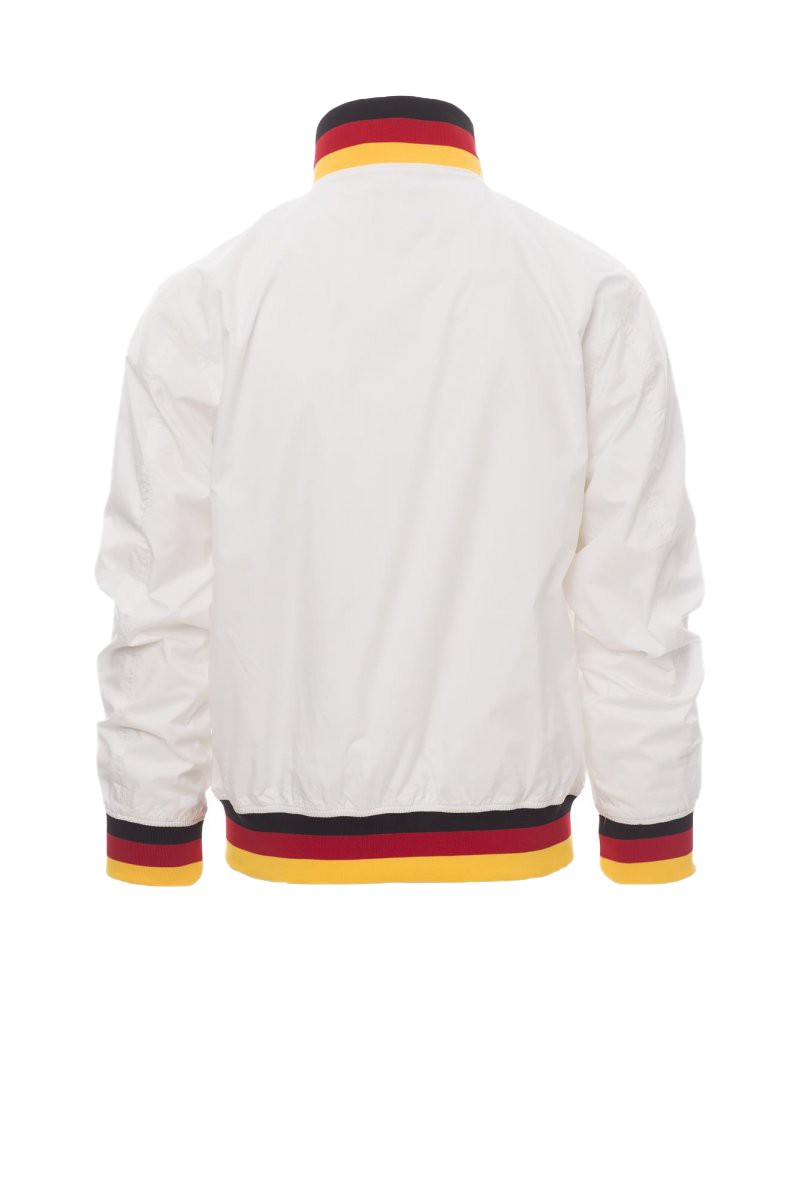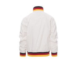 Blouson homme, fermé par zip blanc en plastique avec curseur en métal . Col, poignets et taille en bord-côte couleurs drapeau, deux poches extérieures. Intérieur : non rembourré, doublure en DryTech, une poche intérieure et zip pour faciliter impressions et broderies.