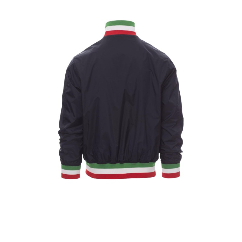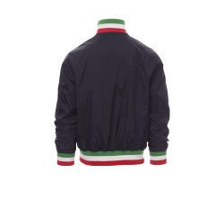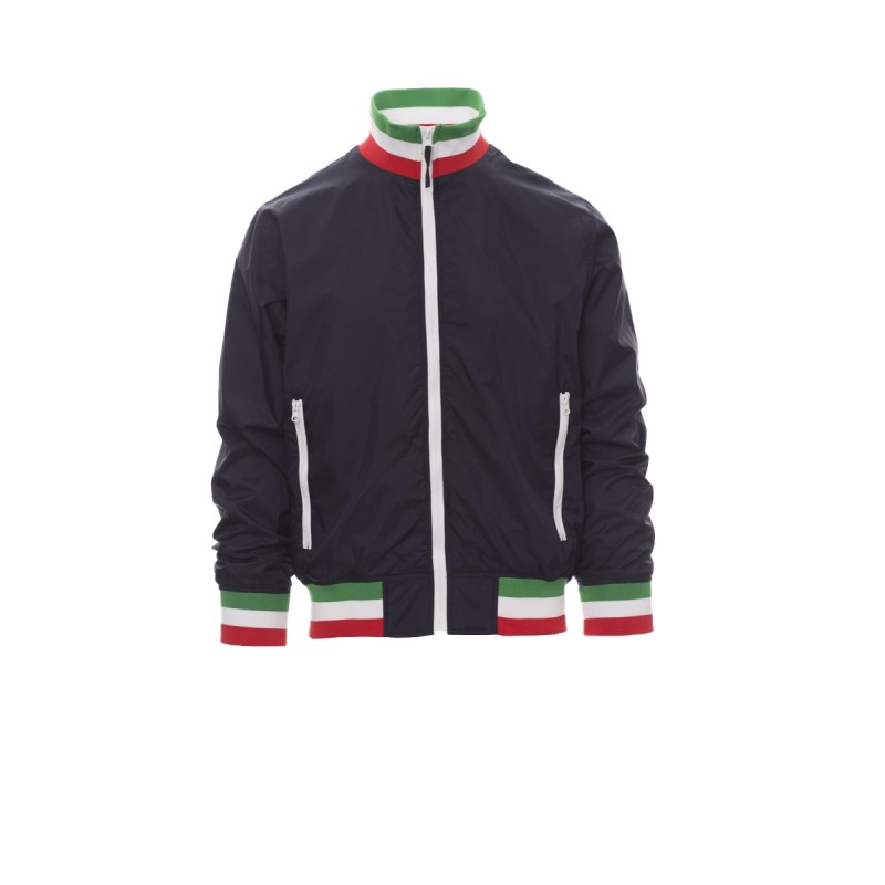 Blouson homme, fermé par zip blanc en plastique avec curseur en métal . Col, poignets et taille en bord-côte couleurs drapeau, deux poches extérieures. Intérieur : non rembourré, doublure en DryTech, une poche intérieure et zip pour faciliter impressions et broderies.