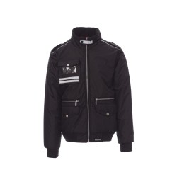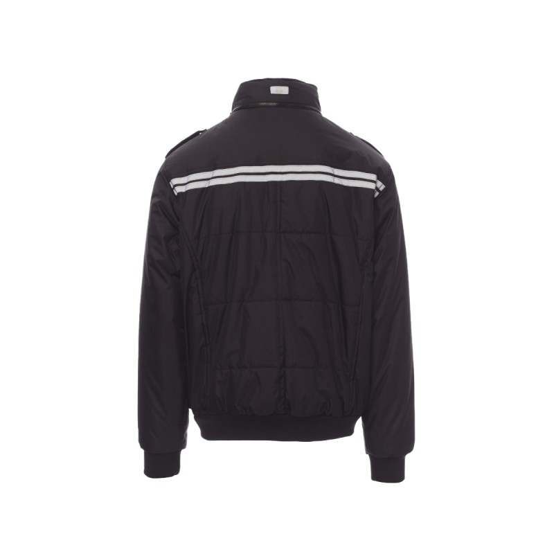 Blouson homme, design informel à effet élancé, zip en plastique avec curseur en métal, capuche pliable dans le col, bord-côte à la taille et aux poignets, épaulettes et fermeture au col, deux poches LOCK SYSTEM, deux poches avec zip, une poche porte-badge réversible, passepoil réfléchissant sur les épaules et double bande réfléchissante sur la poche poitrine et le dos. Intérieur : rembourré, finition avec doublure haute densité argentée, dos en micropolaire, col en polaire, une poche.