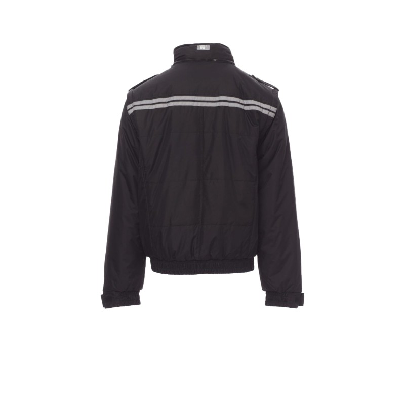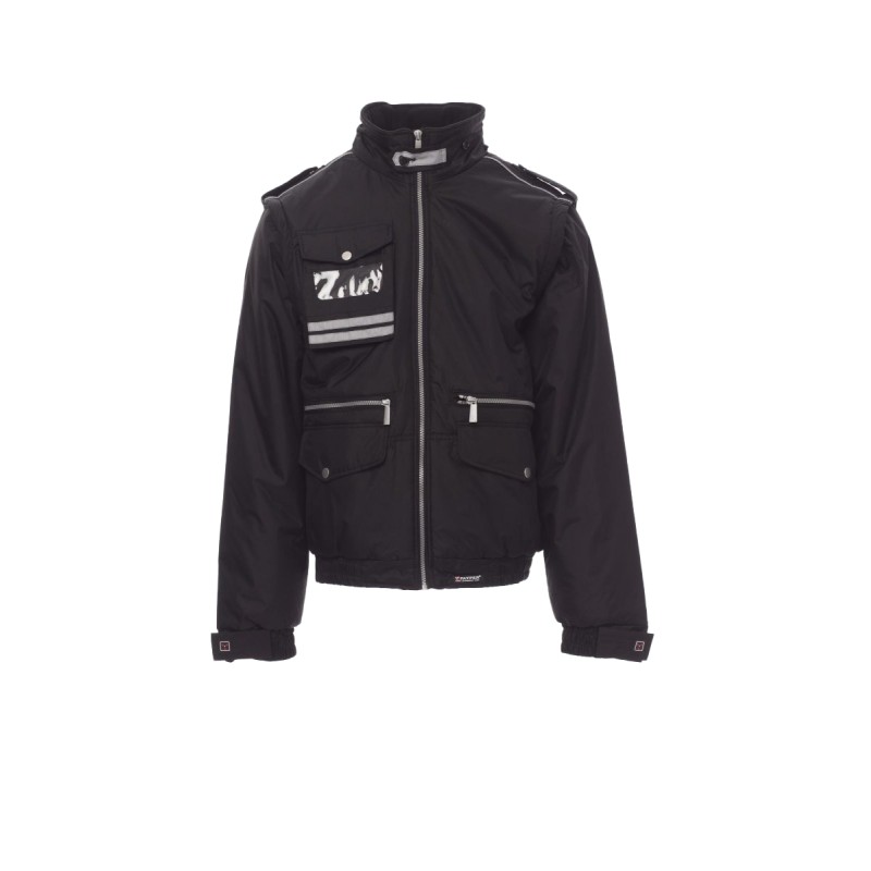 Blouson homme avec manches détachables, design informel à effet élancé, zip en plastique avec curseur en métal, capuche pliable dans le col, taille élastique, poignets réglables, épaulettes et fermeture au col, deux poches LOCK SYSTEM, deux poches zippées, une poche porte-badge réversible, passepoil réfléchissant sur les épaules et double bande réfléchissante sur la poche poitrine et le dos. Intérieur : rembourré, finition avec doublure haute densité argentée, dos en micropolaire, col en polaire, une poche.
