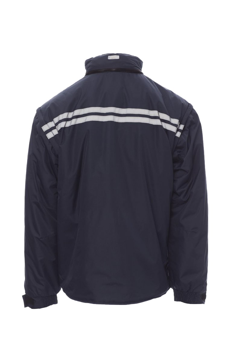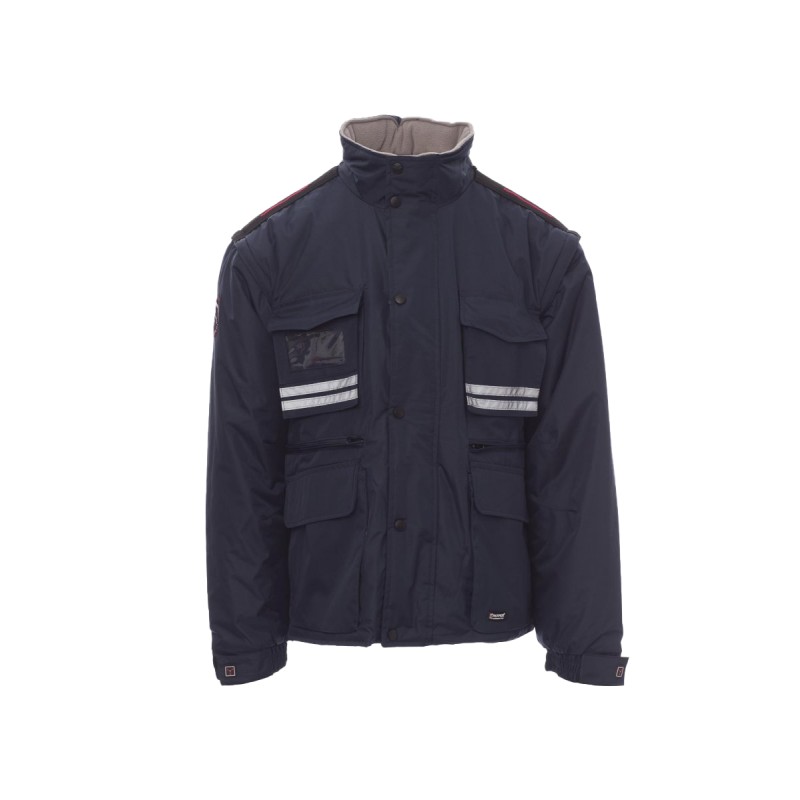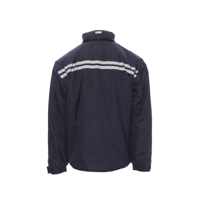Blouson homme, avec manches détachables, zip de 8 mm en plastique avec curseur en métal, rabat et boutons en plastique, capuche profilée détachable et/ou repliable dans le col, poignets réglables, passepoils réfléchissants gris devant et derrière, coudes préformés, fente latérale à soufflet et zip, neuf poches extérieures dont deux LOCK SYSTEM, deux zippées et intérieur renforcé, une avec porte-badge réversible. Intérieur : rembourré, col, dos et chauffe-reins en micropolaire, inserts transpirants sous le bras, coulisse à la taille et fermeture éclair intérieure pour faciliter impressions et broderies.
