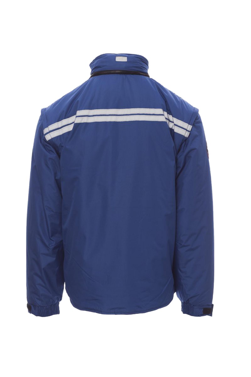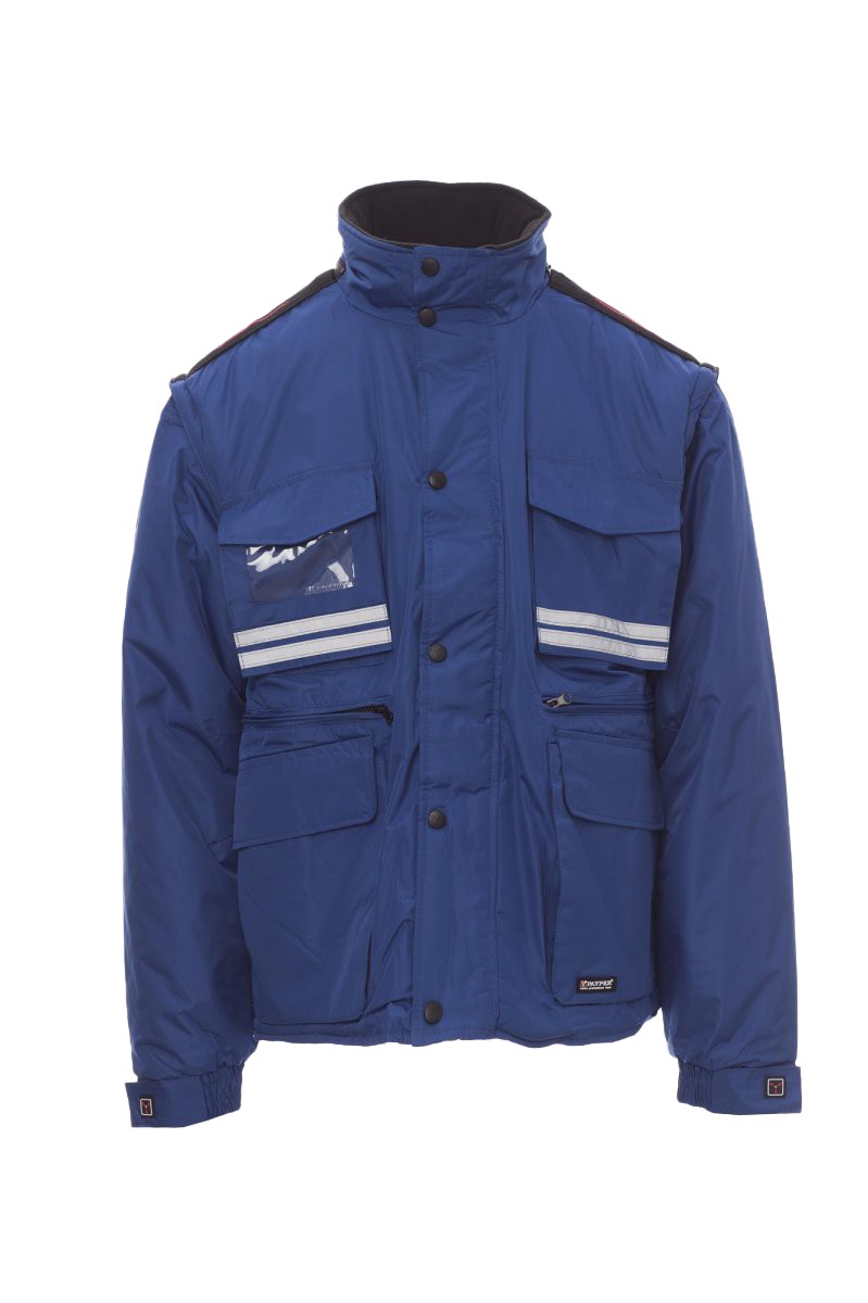 Blouson homme, avec manches détachables, zip de 8 mm en plastique avec curseur en métal, rabat et boutons en plastique, capuche profilée détachable et/ou repliable dans le col, poignets réglables, passepoils réfléchissants gris devant et derrière, coudes préformés, fente latérale à soufflet et zip, neuf poches extérieures dont deux LOCK SYSTEM, deux zippées et intérieur renforcé, une avec porte-badge réversible. Intérieur : rembourré, col, dos et chauffe-reins en micropolaire, inserts transpirants sous le bras, coulisse à la taille et fermeture éclair intérieure pour faciliter impressions et broderies.