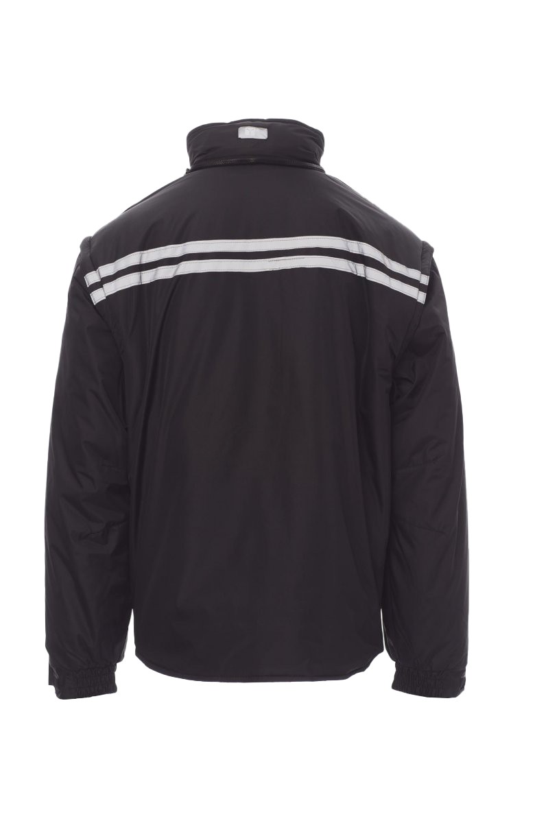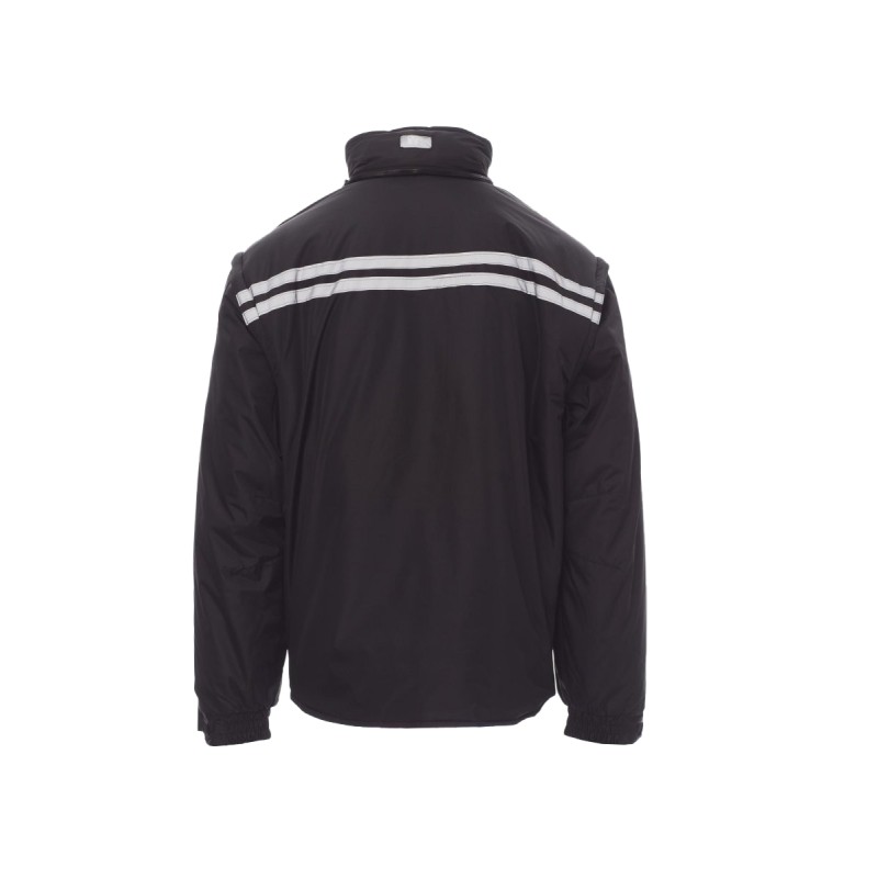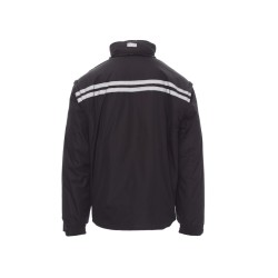Blouson homme, avec manches détachables, zip de 8 mm en plastique avec curseur en métal, rabat et boutons en plastique, capuche profilée détachable et/ou repliable dans le col, poignets réglables, passepoils réfléchissants gris devant et derrière, coudes préformés, fente latérale à soufflet et zip, neuf poches extérieures dont deux LOCK SYSTEM, deux zippées et intérieur renforcé, une avec porte-badge réversible. Intérieur : rembourré, col, dos et chauffe-reins en micropolaire, inserts transpirants sous le bras, coulisse à la taille et fermeture éclair intérieure pour faciliter impressions et broderies.