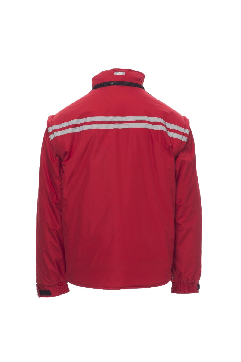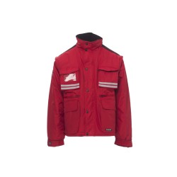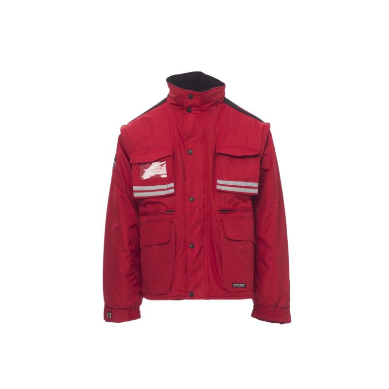 Blouson homme, avec manches détachables, zip de 8 mm en plastique avec curseur en métal, rabat et boutons en plastique, capuche profilée détachable et/ou repliable dans le col, poignets réglables, passepoils réfléchissants gris devant et derrière, coudes préformés, fente latérale à soufflet et zip, neuf poches extérieures dont deux LOCK SYSTEM, deux zippées et intérieur renforcé, une avec porte-badge réversible. Intérieur : rembourré, col, dos et chauffe-reins en micropolaire, inserts transpirants sous le bras, coulisse à la taille et fermeture éclair intérieure pour faciliter impressions et broderies.