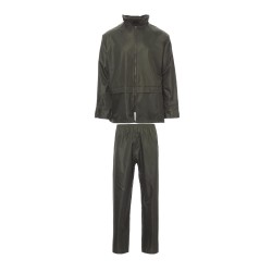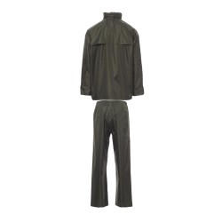 Ensemble anti-pluie, avec enduit en PVC, composé de veste avec zip, capuche pliable dans le col, bas des manches droit, tramage dos. Pantalon avec élastique à la taille et deux poches. Sac individuel avec zip.