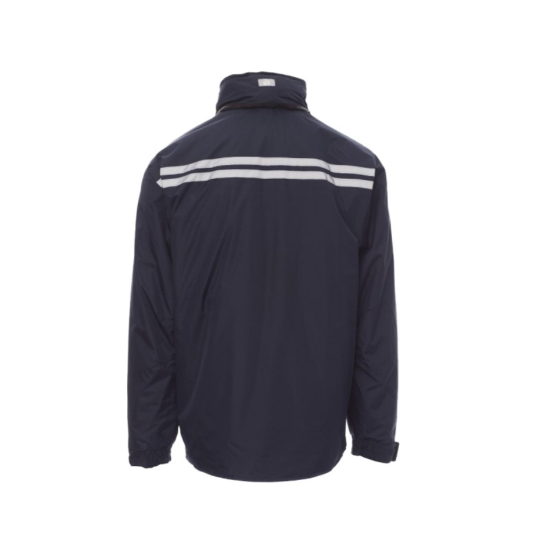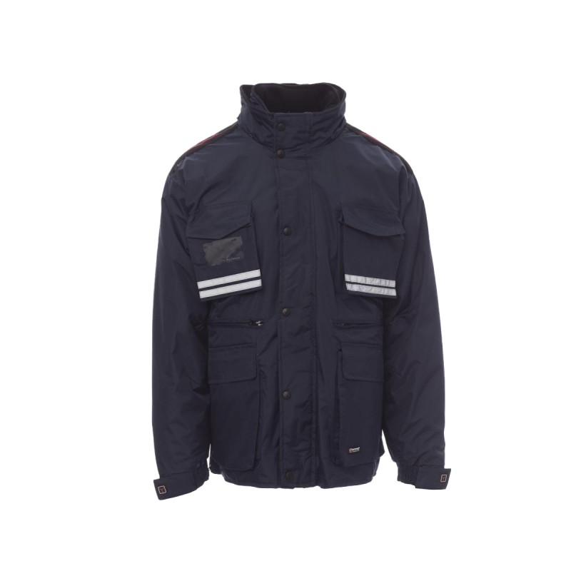 Parka quatre usages comprenant : veste extérieure non rembourrée, doublée en nylon avec col, dos et chauffe-reins en micropolaire et inserts transpirants sous les bras, zip de 8 mm en plastique avec curseur en métal couvert avec patte et boutons en plastique, capuche profilée détachable et/ou pliable dans le col, poignets réglables, bandes réfléchissantes grises devant et derrière, coudes préformés et fente latérale à soufflet et zip, neuf poches extérieures dont deux LOCK SYSTEM, deux avec zip et intérieur renforcé, une avec porte-badge réversible, coulisse à la taille et zip intérieur pour faciliter impressions et broderies. Blouson intérieur rembourré à manches détachables, doublure haute densité et dos en micropolaire, capuche pliable dans le col, cinq poches dont une avec porte-badge réversible, fermeture au col, passepoil réfléchissant sur les épaules et double bande réfléchissante sur la poche poitrine et le dos, intérieur du col en bord-côte, une poche intérieure.