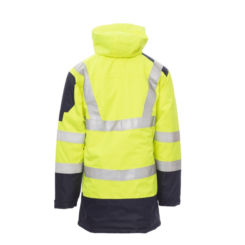Parka bicolore haute visibilité, zip de 8 mm en plastique avec curseur en métal et avec patte et velcro, capuche détachable, profilée et ergonomique avec coulisse, poignets élastiques réglables, grandes poches frontales avec rabat et bouton dont deux avec zip, porte-badge escamotable/détachable . Intérieur : matelassé