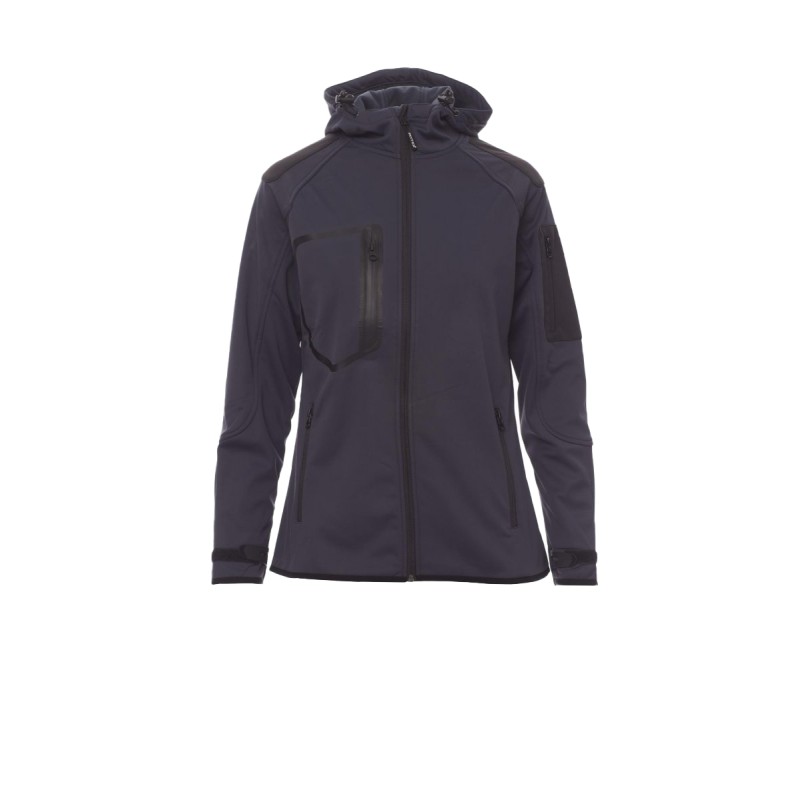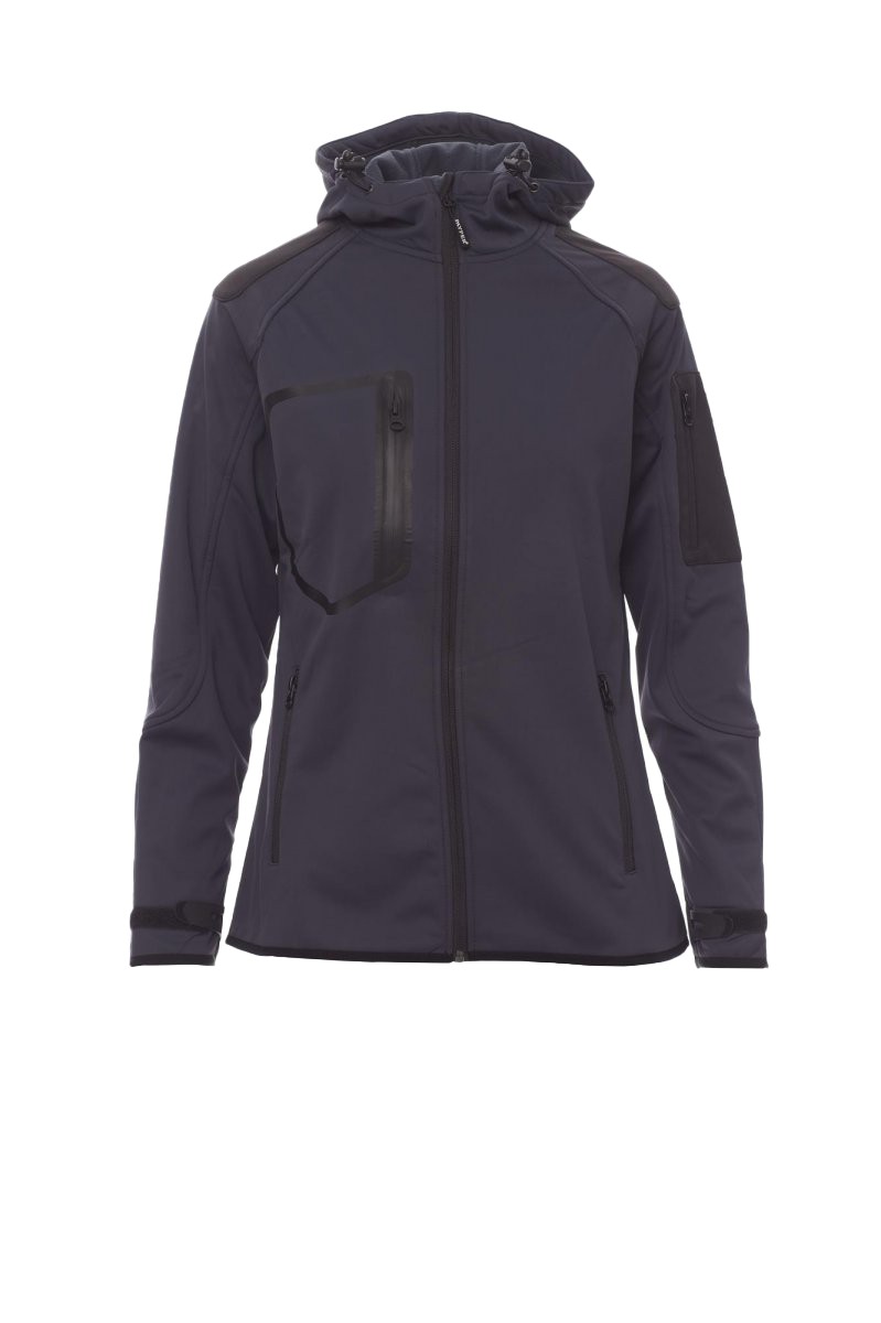 WP 8000 mm H₂O, WVT 5000 g/m² 24h. Veste ergonomique pour femme à manches raglan, capuche profilée à deux coutures et coulisse, fermeture éclair longue SBS avec ruban, poignets réglables avec serre-poignets caoutchoutés en velcro, fin liseré aux poignets et à la taille, deux poches latérales zippées, une poche sur poitrine et une poche sur bras gauche.