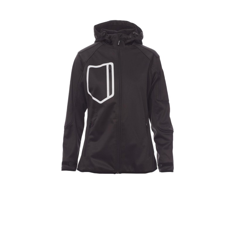 WP 8000 mm H₂O, WVT 5000 g/m² 24h. Veste ergonomique pour femme à manches raglan, capuche profilée à deux coutures et coulisse, fermeture éclair longue SBS avec ruban, poignets réglables avec serre-poignets caoutchoutés en velcro, fin liseré aux poignets et à la taille, deux poches latérales zippées, une poche sur poitrine et une poche sur bras gauche.