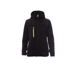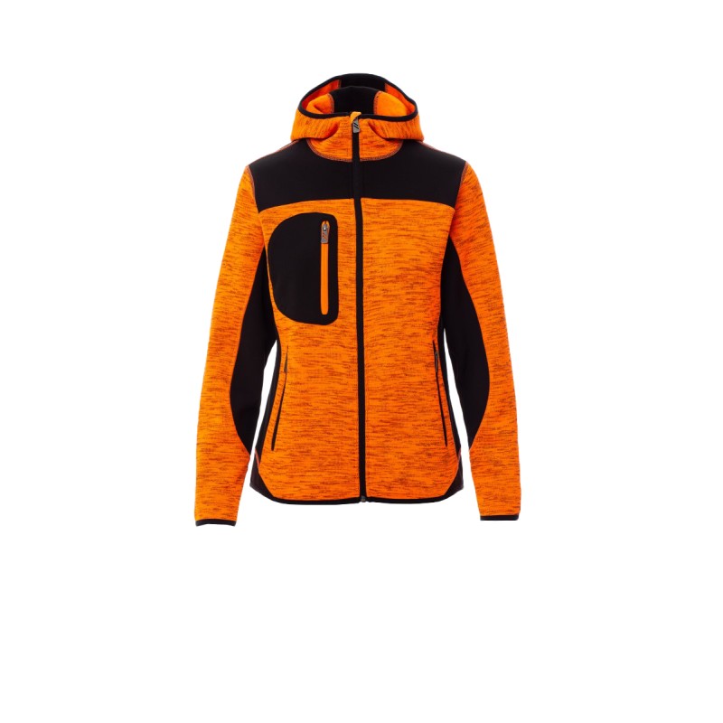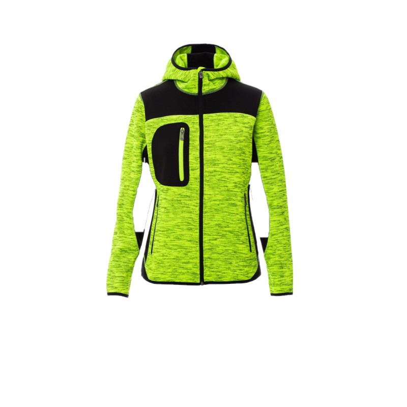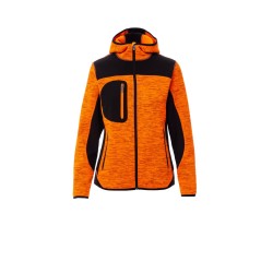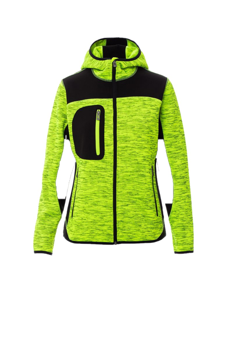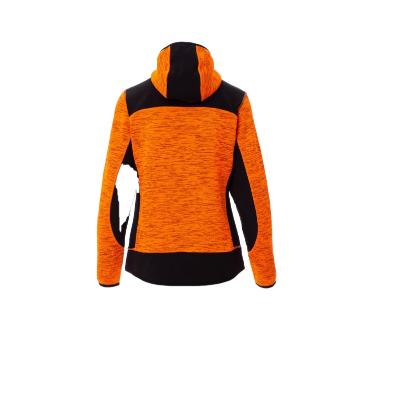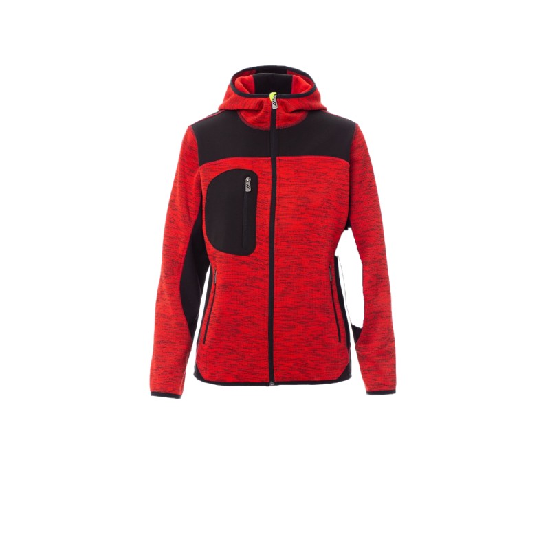 Tricot technique avec inserts en soft-shell noirs, bicolore, zip long SBS avec ruban, capuche profilée avec deux coutures, fin liseré aux poignets et à la taille, deux poches latérales avec zip, une poche poitrine.
