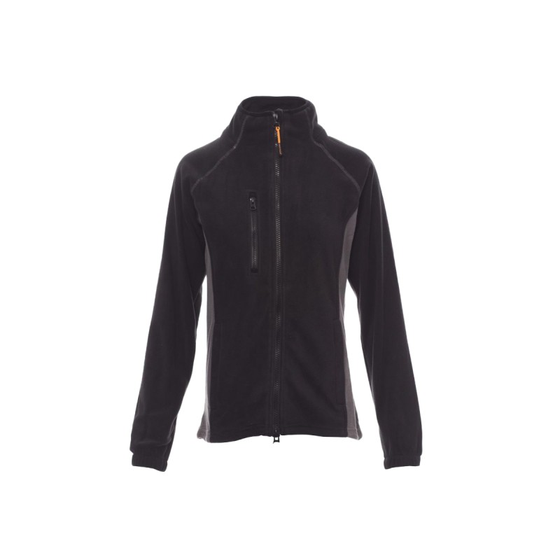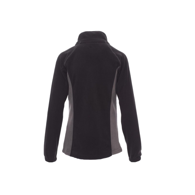 Veste polaire bicolore cintrée pour femme à zip intégral de 8 mm en plastique noir, manches raglan, coulisse réglable à la taille, élastiques serre-poignet, deux poches avec zips couverts, une poche avec zip sur le devant, col avec bordure de renfort en contraste, coutures renforcées.
