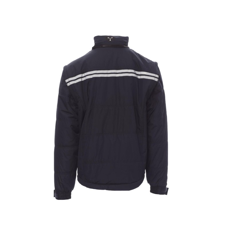 Blouson homme, manches détachables, zip en plastique de 8 mm avec curseur en métal, à rabat et boutons en plastique, dos profilé et capuche repliable dans le col, deux poches extérieures LOCK SYSTEM et deux poches zippées, poches obliques pour faciliter l’introduction des mains, une poche poitrine pour smartphone et anneau porte-badge, bandes réfléchissantes sur la poche et le dos. Intérieur : rembourré, polaire en contraste sur le dos et le col, une poche, zip intérieur pour faciliter les impressions et les broderies.