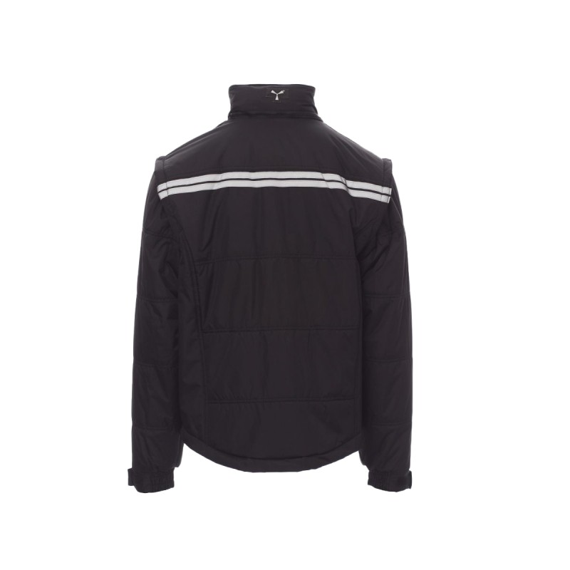 Blouson homme, manches détachables, zip en plastique de 8 mm avec curseur en métal, à rabat et boutons en plastique, dos profilé et capuche repliable dans le col, deux poches extérieures LOCK SYSTEM et deux poches zippées, poches obliques pour faciliter l’introduction des mains, une poche poitrine pour smartphone et anneau porte-badge, bandes réfléchissantes sur la poche et le dos. Intérieur : rembourré, polaire en contraste sur le dos et le col, une poche, zip intérieur pour faciliter les impressions et les broderies.
