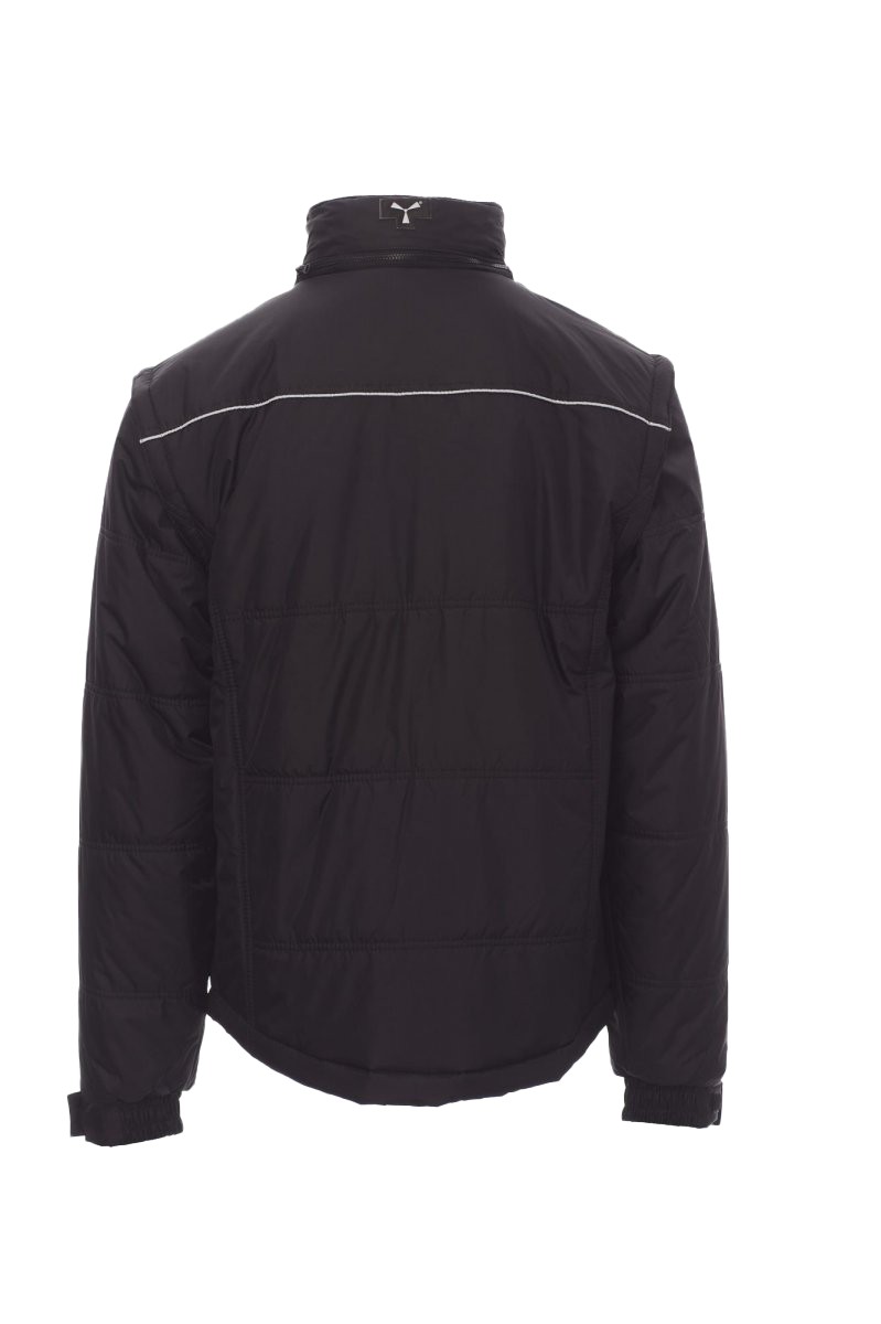 Blouson homme, à manches détachables, arrière profilé, zip de 8 mm en plastique avec curseur en métal, capuche escamotable, deux grandes poches extérieures avec zip, grande poche de poitrine pour smartphone, anneau porte-badge, passepoil réfléchissant sur la poitrine et le dos. Intérieur : rembourrage matelassé et doublure haute densité, intérieur du col en polaire, une poche.