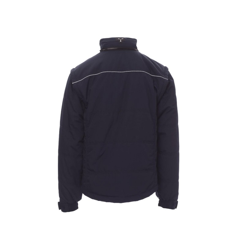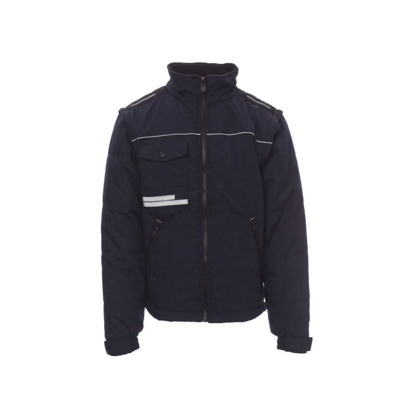 Blouson homme, à manches détachables, arrière profilé, zip de 8 mm en plastique avec curseur en métal, capuche escamotable, deux grandes poches extérieures zippées, grande poche de poitrine multifonction et porte-smartphone avec bandes réfléchissantes, anneau porte-badge. Intérieur : rembourrage matelassé et doublure haute densité, intérieur du col en polaire, une poche.