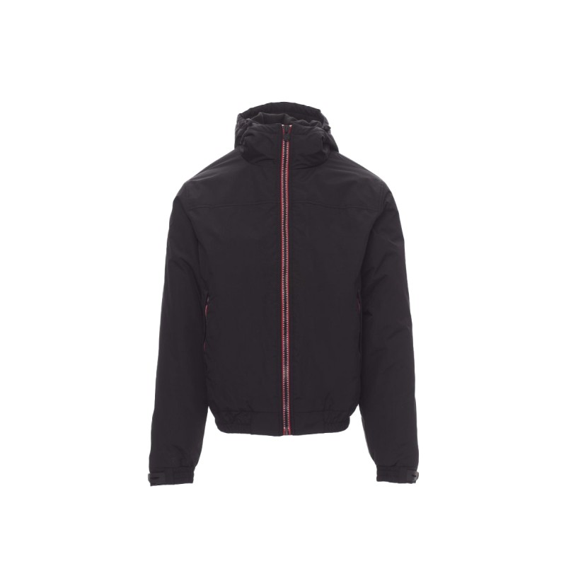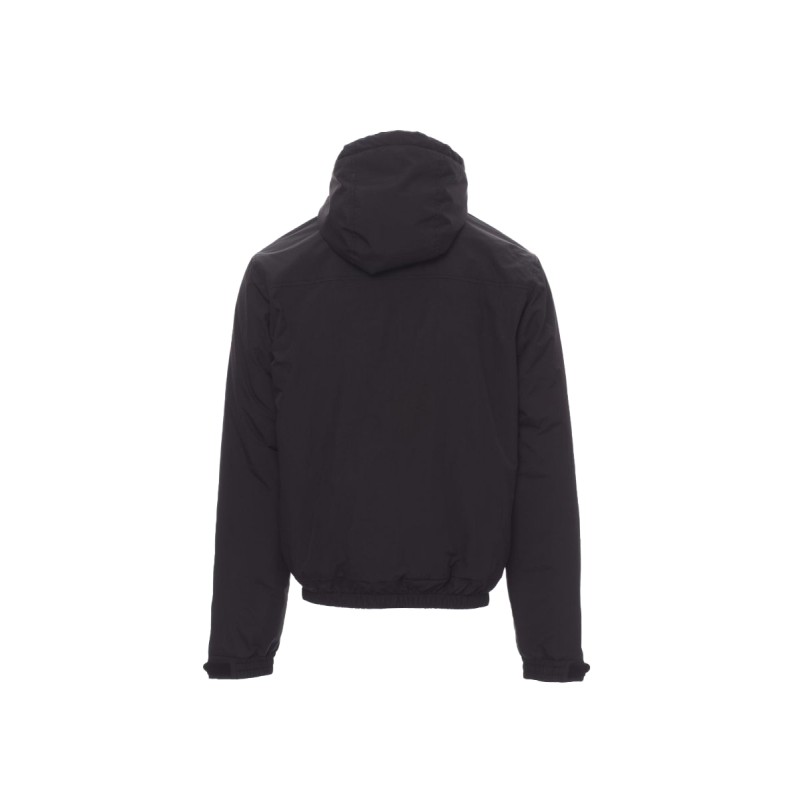 Blouson homme rembourré, zip de 8 mm en contraste, capuche profilée à deux coutures et coulisse, élastique à la taille, poignets avec élastique et serre-poignets caoutchouc de réglage, deux poches extérieures avec zip couvert. Intérieur : micropolaire sur le col et le dos, une poche zippée pour smartphone avec passage pour câble, zip sur la poitrine et le dos pour faciliter les impressions et broderies.